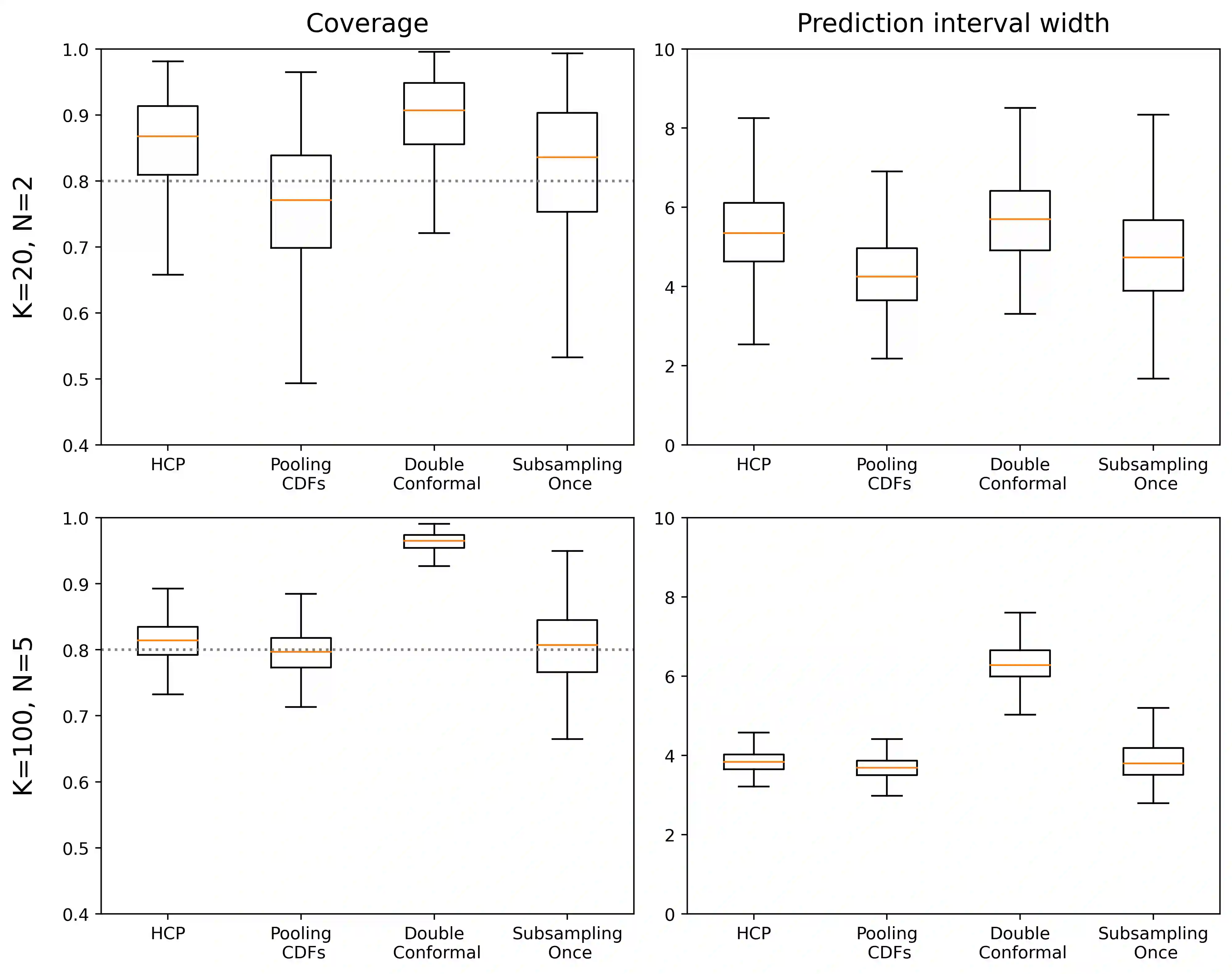 This paper studies distribution-free inference in settings where the data set has a hierarchical structure -- for example, groups of observations, or repeated measurements. In such settings, standard notions of exchangeability may not hold. To address this challenge, a hierarchical form of exchangeability is derived, facilitating extensions of distribution-free methods, including conformal prediction and jackknife+. While the standard theoretical guarantee obtained by the conformal prediction framework is a marginal predictive coverage guarantee, in the special case of independent repeated measurements, it is possible to achieve a stronger form of coverage -- the "second-moment coverage" property -- to provide better control of conditional miscoverage rates, and distribution-free prediction sets that achieve this property are constructed. Simulations illustrate that this guarantee indeed leads to uniformly small conditional miscoverage rates. Empirically, this stronger guarantee comes at the cost of a larger width of the prediction set in scenarios where the fitted model is poorly calibrated, but this cost is very mild in cases where the fitted model is accurate.