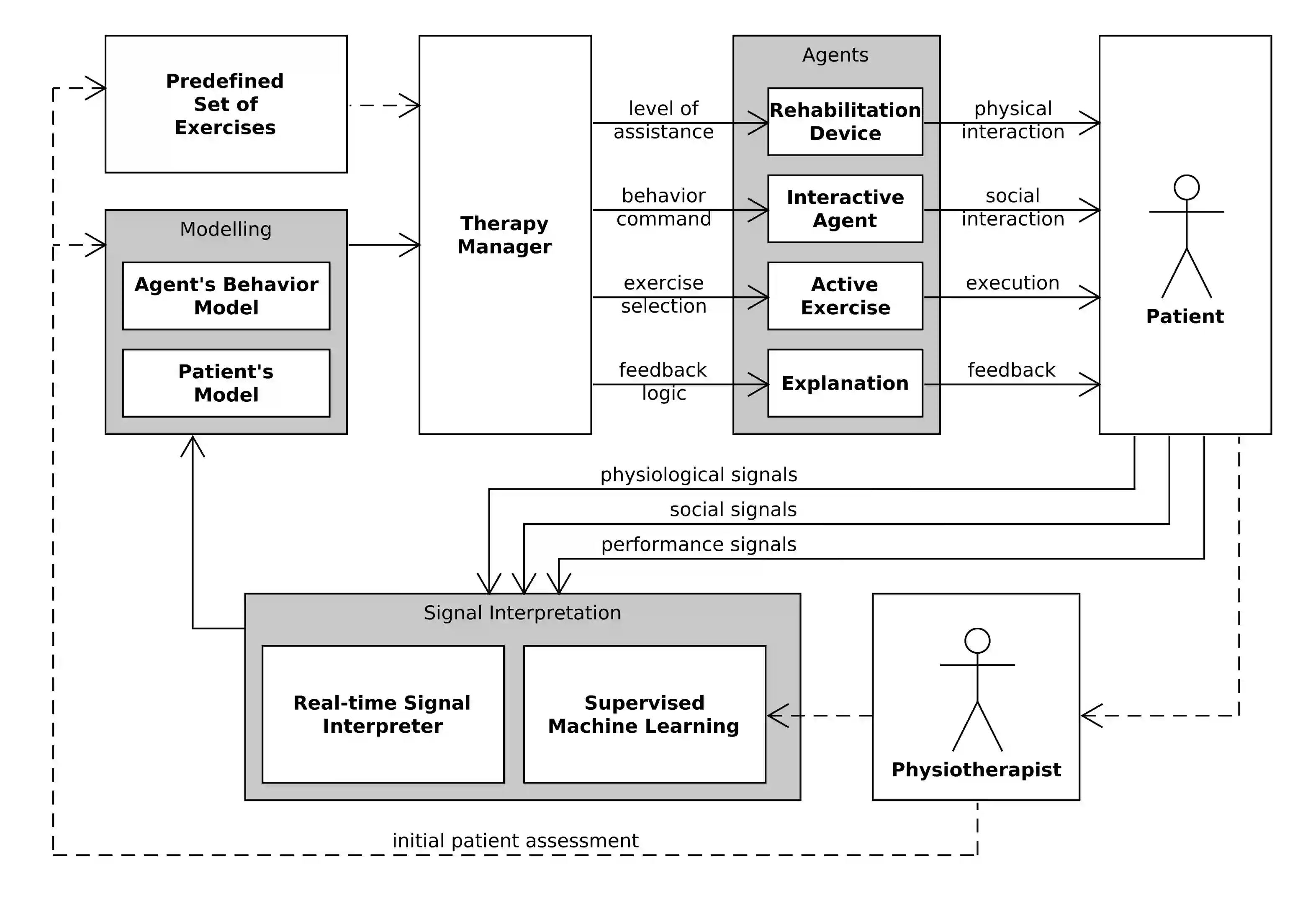 翻译:在当今世界,许多认知障碍和运动机能障碍的患者寻求专家的关注,以实施具体的常规疗法来改善他们的状况,然而,由于缺乏神经康复专业人员,患者遭受了恶化其状况的严重影响。在本文件中,我们为新颖的机器人神经康复培训系统提出了一个技术方法,它依赖于康复装置、信号分类方法、培训适应的受监督机器学习模式、培训练习以及作为用户界面的社会互动代理等组合。与专业人士一起,该系统可以针对患者的具体需求进行培训。此外,在培训阶段之后,病人可以在家中独立接受培训,而无需由具有社会互动代理的物理治疗师和辅导助理协助。
