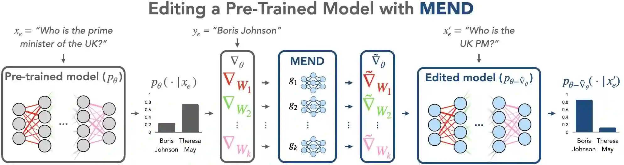 翻译:尽管经过事先培训的大型模型使得在各种下游任务上取得了令人印象深刻的结果,但最大的现有模型仍然会出错,甚至准确的预测可能随着时间的推移而过时。由于不可能在培训时间发现所有这些失败,因此不可能在培训时间发现所有这些失败,使这些模型的开发者和终端用户能够纠正不准确的产出,而使模型保持原样,这是可取的。然而,大型神经网络所学的演示的分布式黑箱性质使得难以产生这种有针对性的编辑。如果只用单一的有问题的投入和新的预期产出来显示,微调方法往往会过度适用;其他编辑算法要么计算不可行,要么在应用非常大的模型时效果不明显。为了便于在规模上进行容易的后热编辑,我们建议模型的模型网型(MEND)和终端编辑网(MEND)能够使用单一所需的投入-输出配对来快速进行本地编辑。 MEND学会只学会改变通过标准微调获得的梯度模型取得的梯度,使用10亿分级的梯度的梯度的梯度,甚至使这一变形模型的参数化。MEND在10亿个经过训练的模型上进行快速的GPL的测试。