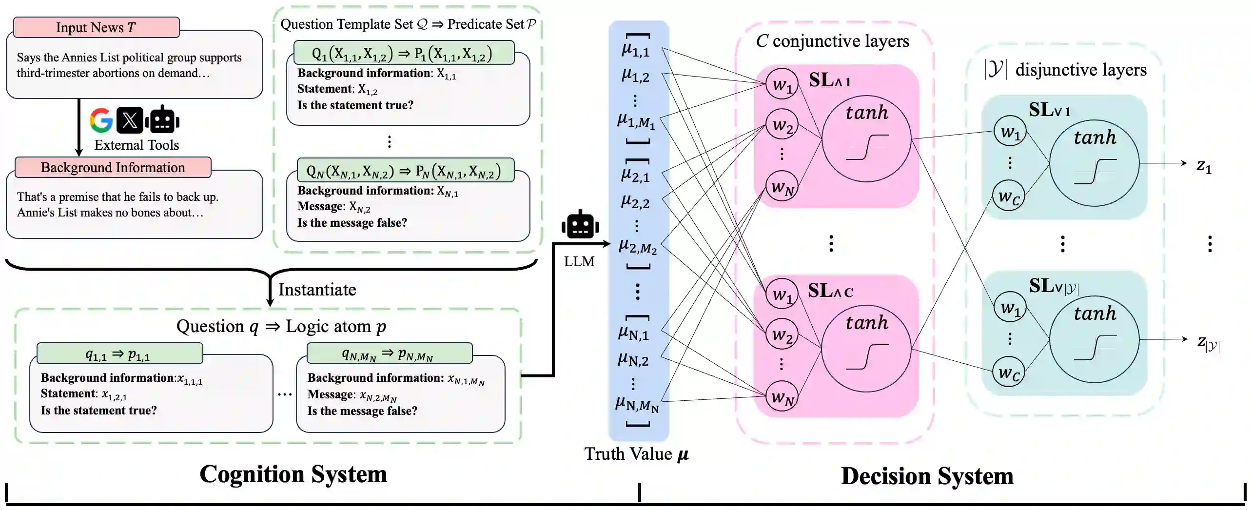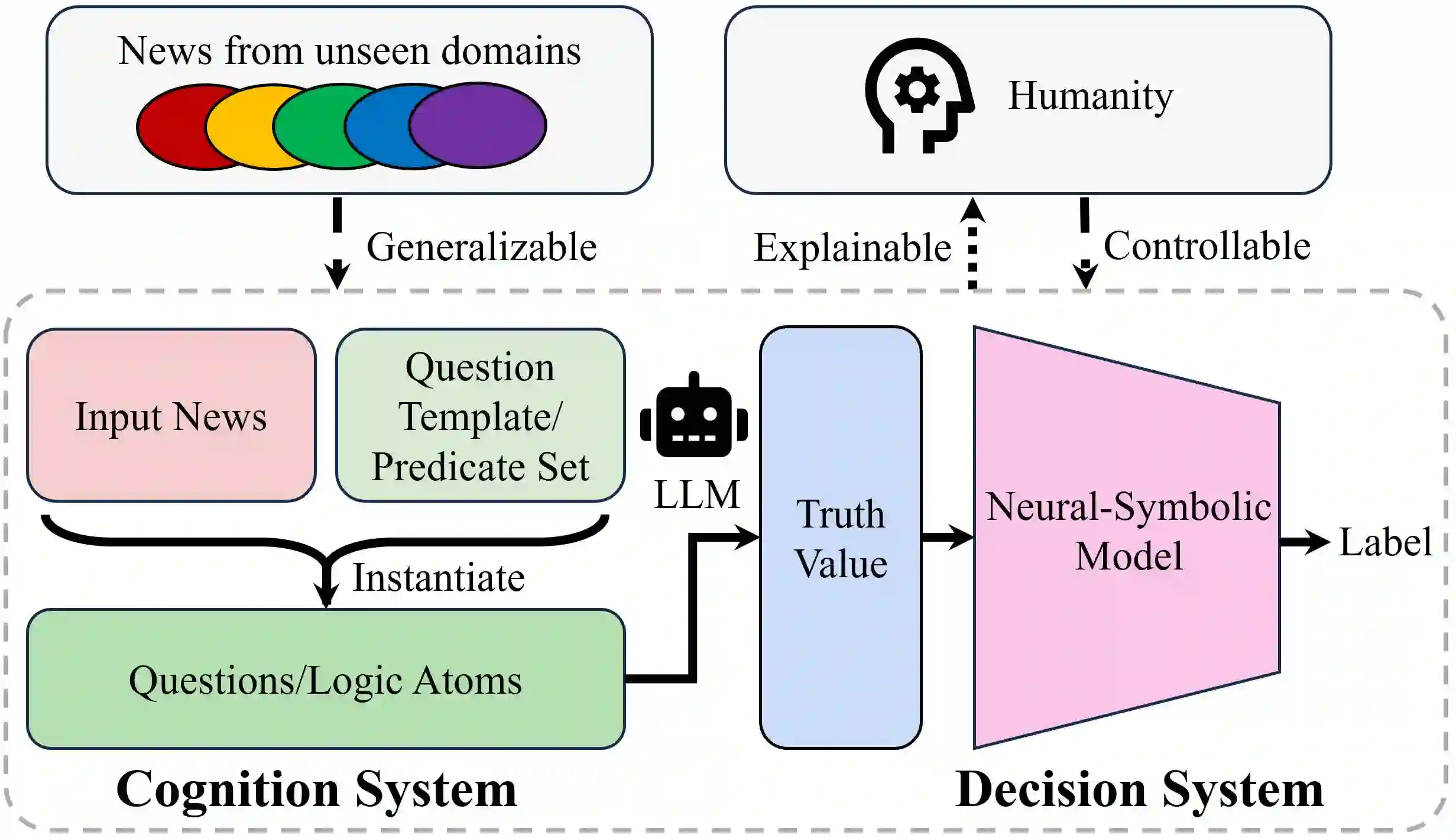 The proliferation of fake news has emerged as a severe societal problem, raising significant interest from industry and academia. While existing deep-learning based methods have made progress in detecting fake news accurately, their reliability may be compromised caused by the non-transparent reasoning processes, poor generalization abilities and inherent risks of integration with large language models (LLMs). To address this challenge, we propose {\methodname}, a novel framework for trustworthy fake news detection that prioritizes explainability, generalizability and controllability of models. This is achieved via a dual-system framework that integrates cognition and decision systems, adhering to the principles above. The cognition system harnesses human expertise to generate logical predicates, which guide LLMs in generating human-readable logic atoms. Meanwhile, the decision system deduces generalizable logic rules to aggregate these atoms, enabling the identification of the truthfulness of the input news across diverse domains and enhancing transparency in the decision-making process. Finally, we present comprehensive evaluation results on four datasets, demonstrating the feasibility and trustworthiness of our proposed framework. Our implementation is available at \url{https://github.com/less-and-less-bugs/Trust_TELLER}.
