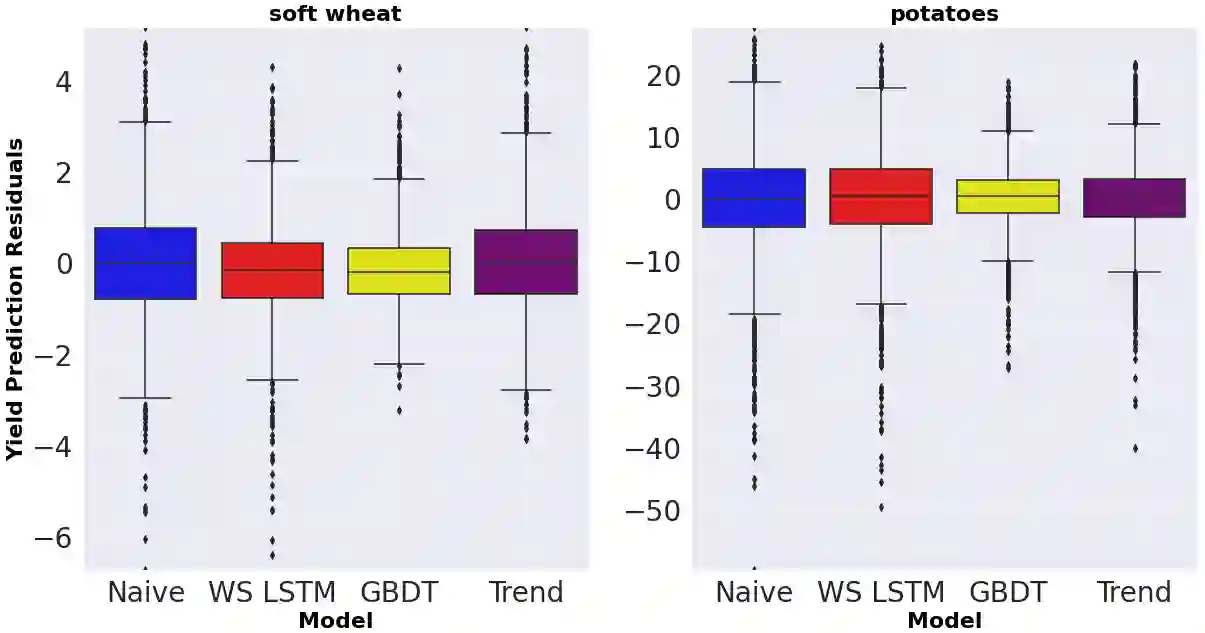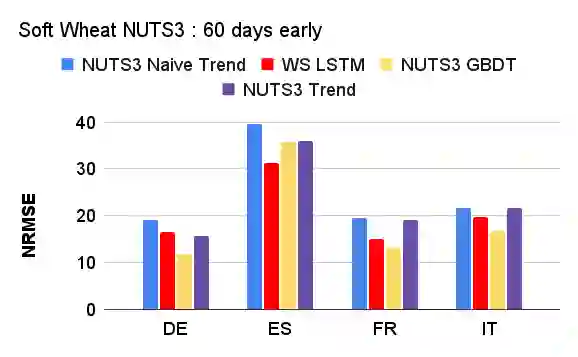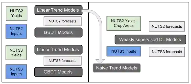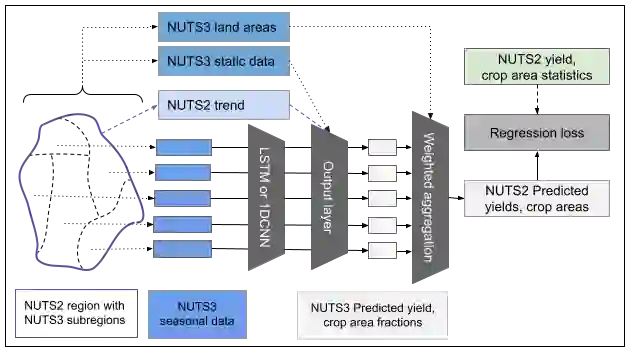 翻译:用于作物产量预测的预测投入和标签数据并非总能在同一空间分辨率中找到。我们提议一个深层次学习框架,使用高分辨率投入和低分辨率标签来制作两个空间水平的作物产量预测。预测模型由低分辨率作物面积和产量统计数据的薄弱监督加以校准。我们通过将欧洲五个国家(德国、西班牙、法国、匈牙利、意大利)和两个作物(软小麦和土豆)的区域产量从母统计区域分列到次区域,对该框架进行了评估。对受监督薄弱模型的性能与线性趋势模型和Gradient-boosted决策树(GDT)进行了比较。高分辨率作物产量预测对决策者和其他利益攸关者都有用。即使没有高分辨率产量数据,但受监督的深度学习方法也为生成此类预测提供了一种途径。