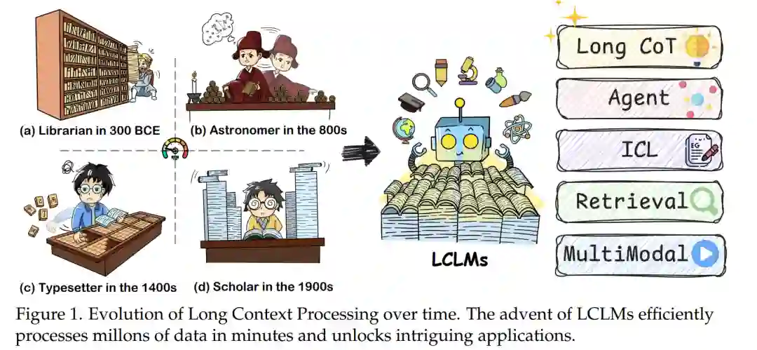 高效数据处理始终是人类孜孜以求的目标——受限于生物本能,人类只能进行局部、线性的阅读,手动处理长上下文数据效率极其低下。如图1所示,回溯历史长河:公元前300年,亚历山大图书馆的学者需手工抄写、校对手稿并编纂目录,以管理数十万卷古籍[553];公元8世纪,唐代司天监官员需人工处理海量天文观测数据以推算节气[554];15世纪,印刷工人必须手动排布数以万计的活字版才能印制报纸[552];直至20世纪,学者仍需逐篇查阅数十甚至数百份文献方能掌握某个领域的全貌。 语言模型的出现终于带来了革命性跃迁[42, 108, 197等],其能在数分钟内自动处理文本数据。这些模型通过固定上下文窗口对输入序列进行概率建模,实现下一词元预测。早期模型仅能处理数个至数十个词元[36, 61等];随着BERT[101]和GPT-3[37]分别将上下文长度扩展至数百和数千词元,段落、文档及多轮对话的自动处理首度成为可能。近年来,长上下文语言模型(LCLMs)更将上下文长度从4K呈指数级提升至128K[154]、1M[596]甚至10M[499]词元,可单次处理托尔斯泰级巨著(56万字),将人类60小时的阅读量压缩至分钟级计算。更重要的是,超长上下文为测试时扩展[164, 386]提供了空间——模型能在单次上下文中探索、反思、回溯与总结,从根本上改变了人类与生成式AI的交互模式,并解锁了一系列惊艳能力: * 类o1的长链推理[164, 373, 386] * 复杂智能体工作流[506] * 卓越的上下文学习[366, 499] * 高效信息检索与理解[262, 531] * 先进多模态智能[507, 550]
