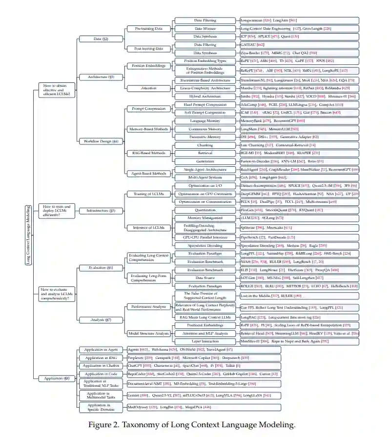 本文系统梳理了长上下文语言建模的研究进展。如图2所示,我们围绕三大核心维度展开: RQ1:如何获得高效能LCLMs? RQ2:如何高效训练与部署LCLMs? RQ3:如何全面评估与分析LCLMs? 除上述方向外,我们还深入探讨了LCLMs的多样化应用场景。 首先(对应RQ1),我们从数据策略(§2)、架构设计(§3)和工作流设计(§4)三方面展开: * 数据策略:详述预训练/微调阶段的数据工程方法,包括数据选择、过滤、合成与混合等 * 架构设计:系统分析三大类方案——基于Transformer的改进、线性复杂度架构、混合范式 * 工作流设计:涵盖提示压缩、基于记忆/检索增强生成(RAG)/智能体的扩展方案