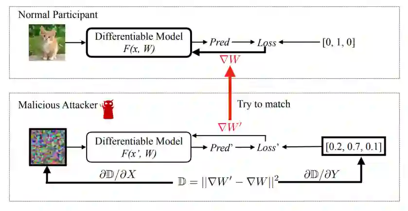 图 2.1: 梯度深层渗漏(DLG) 算法概览。需要更新的变量用粗体边框标出。正常参与者使用其私人训练数据计算 W 以更新参数,而恶意攻击者则更新其虚拟输入和标签,以最小化梯度距离。优化结束后,恶意用户可以从诚实的参与者那里获得训练集。[1]