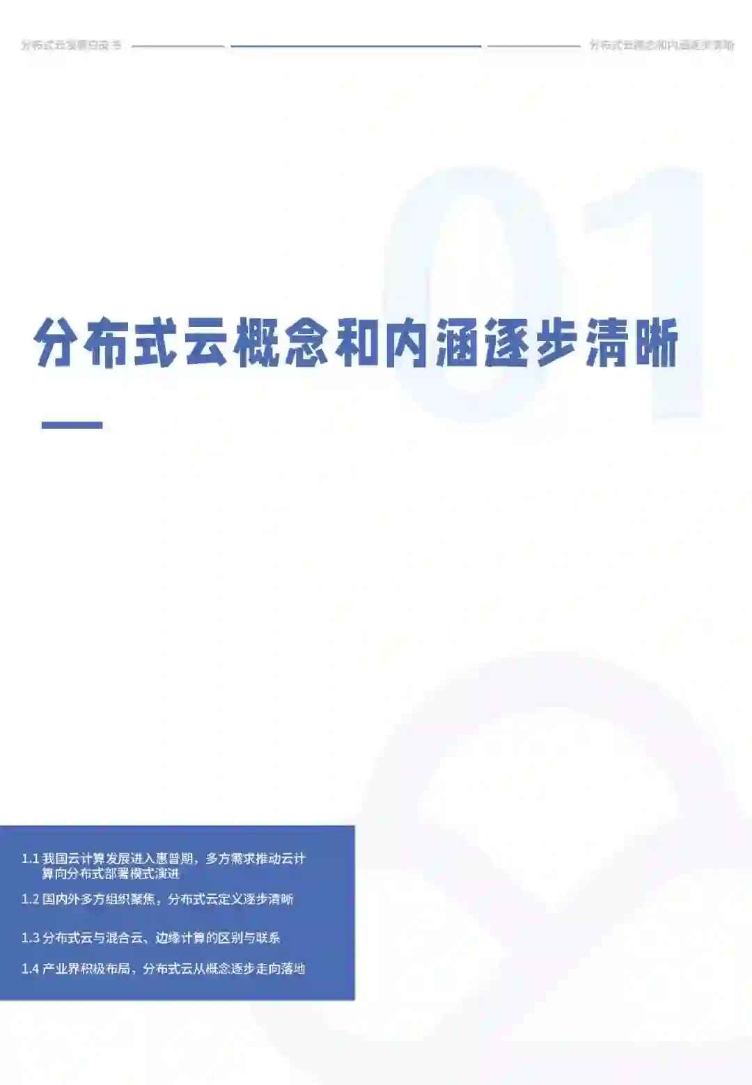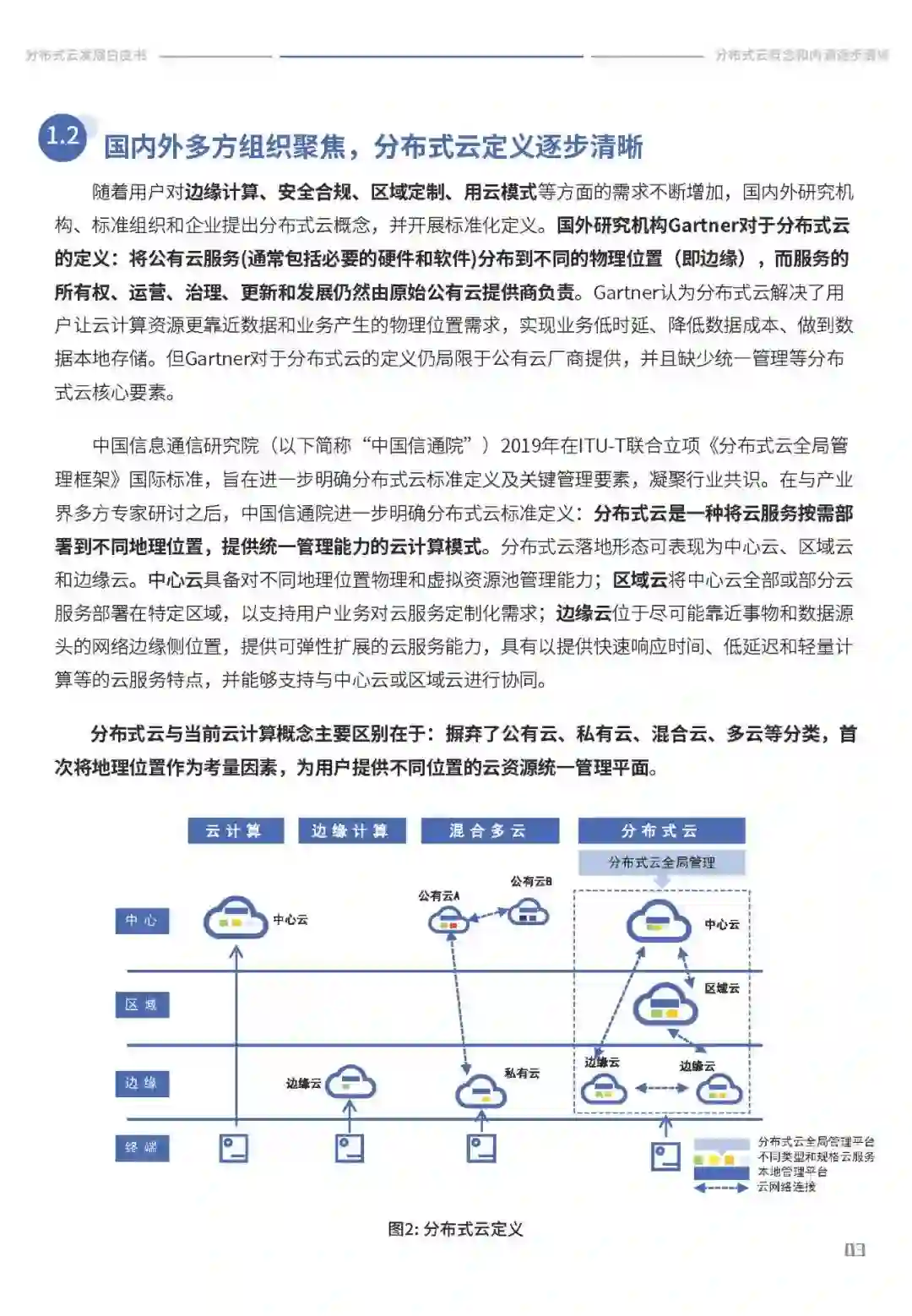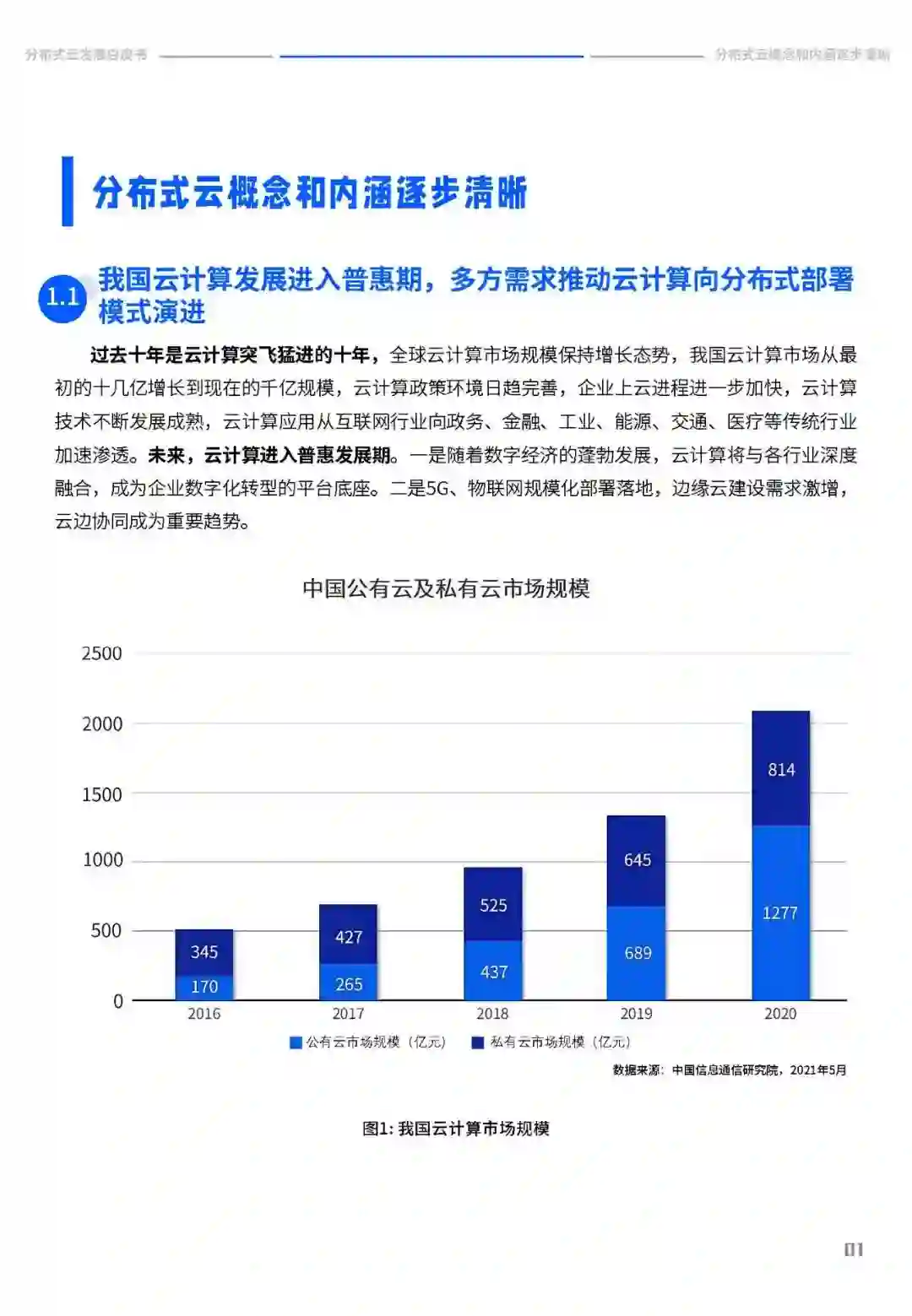 过去十年,我国云计算快速发展,2020年云计算整体市场规模达到2091亿元,在全球范围内呈现逆势增长态势。我国云计算政策环境不断完善,产业不断发展成熟,技术、架构、安全、管理、软件、等方面繁荣发展。在数字化浪潮之下,5G、物联网规模化部署推动边缘计算需求激增,愈发严格的数据安全监管要求以及混合多云等不断变化的企业用云模式相关因素推动云计算从单一数据中心部署向不同物理位置多数据中心部署、从中心化架构向分布式架构扩展升级,分布式云概念也由此而生,成为云计算未来重要演进趋势。