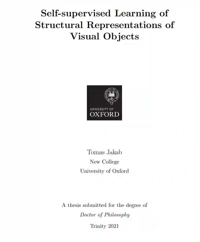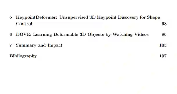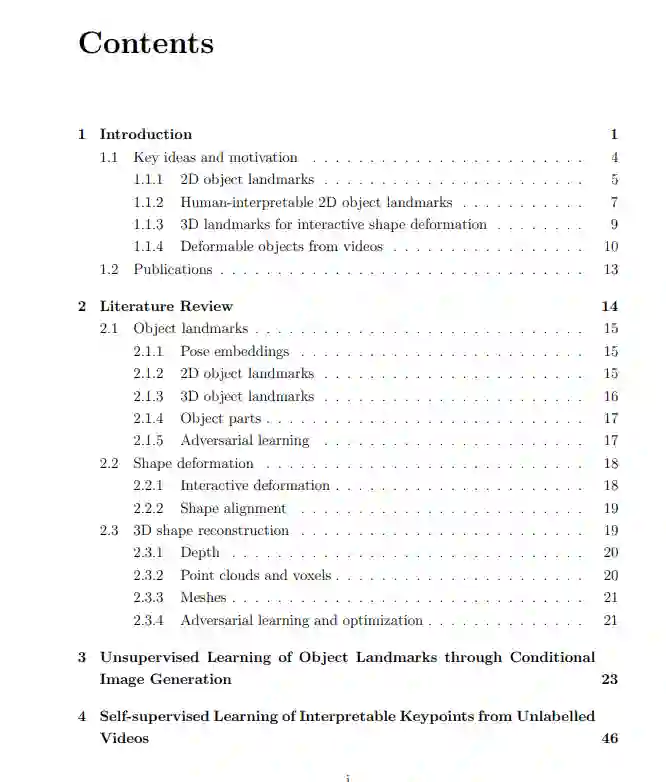 本文探讨了计算机如何使用自监督学习在没有强监督的情况下学习视觉对象的结构。我们演示了我们可以使用一个以重构为关键学习信号的自动编码框架来学习对象的结构表示。我们通过工程瓶颈将对象结构从其他变化因素中分离出来来做到这一点。此外,设计了以2D和3D物体地标或3D网格形式表示物体结构的瓶颈。具体来说,我们开发了一种自动发现2D对象地标的方法,无需任何注释,该方法使用带有2D关键点瓶颈的条件自动编码器,将表示为2D关键点的姿势和外观分离开来。**尽管自监督学习方法能够学习稳定的物体地标,但自动发现的地标与人类标注者标注的地标不一致。为解决这个问题,本文提出一种方法,通过引入一种新的地标自编码,将未配对的经验先验注入到条件自编码器中,可以利用对抗性学习中使用的强大图像鉴别器。**这些条件自动编码方法的一个副产品是,可以通过操纵瓶颈中的关键点来交互控制生成。我们利用这一特点在一个新的方法进行交互式3D形状变形。该方法以自监督的方式训练,使用自动发现的3D地标来对齐对3D形状。在测试时间内,该方法允许用户通过发现的三维物体标志进行物体形状的交互变形。最后,我们提出了一种利用光几何自编码器恢复物体类别三维形状的方法,而不需要任何三维注释。它使用视频进行训练,并学会将输入的图像分解为刚性的姿势、纹理和可变形的形状模型。