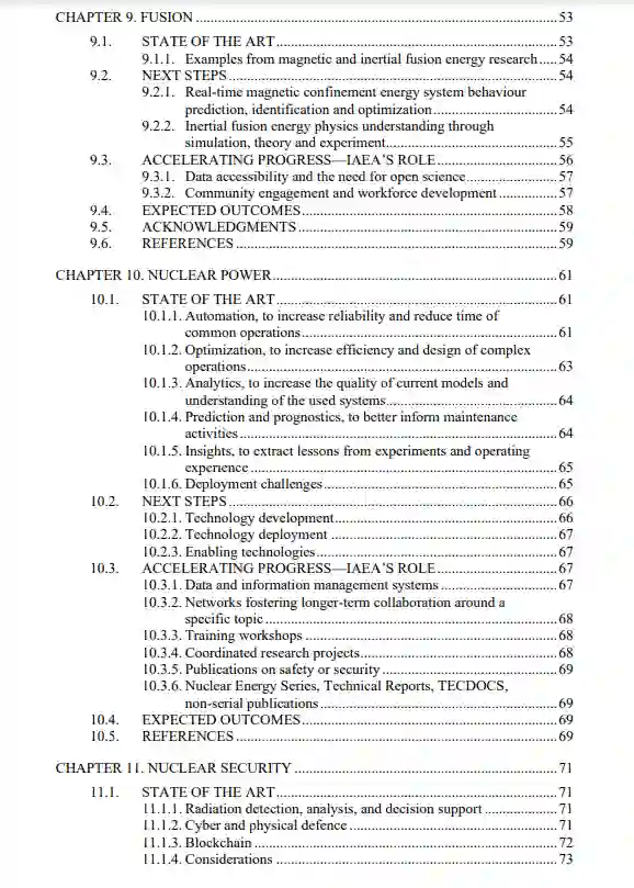 在核科学领域,人工智能驱动研究的重点是核数据流程的自动化。这些努力包括,例如,通过使用自然语言处理应用程序编译来自出版物的数据集,以及正在进行的使用ML方法进行鲁棒推理和有意义的不确定性预测的工作。此外,人工智能还可以协助验证任务和验证实验的设计。在核物理学界,人工智能和ML方法被应用于数据分析和理论建模,以提高科学理解和提高数据处理和管理的效率。进一步的努力涉及未来实验的设计和现有装置的优化,以及用于核物理的设施的操作,例如粒子加速器。最近在应用人工智能和ML方法解决磁约束和惯性约束聚变研究中的突出问题方面取得的成功表明,这些方法具有显著加速聚变研发的潜力。全球范围内的融合研发工作可以通过AI和ML更广泛地参与融合问题解决方案而受益。在核电领域,行业可以在自动化、设计优化、数据分析、预测和预测、见解提取等领域受益于AI。目前的工作重点是将人工智能技术从试点研究转移到更广泛的应用。在辐射防护方面,人工智能的应用及其与控制和监测过程的集成(如外部照射的个人剂量测定)有望产生更快、更灵活和更有效的过程,并有可能在该领域实现深层次的技术变革。特别是人工智能在分析、解释和理解包括辐射暴露在内的复杂工作过程时,可以模拟人类的认知。