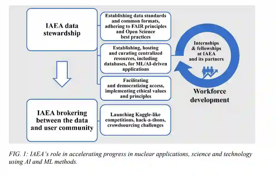 近年来,人工智能(AI)和机器学习(ML)方法在科学技术领域产生了重大影响。这些从数据集或模拟人类表现方面的基于逻辑的算法生成模型的方法同样可以加速核应用、科学和技术领域实现原子能机构促进和平、健康和繁荣的目标。如图1所示,为了在这些领域实现人工智能的总体进展,特别是ML,原子能机构可以发挥重要作用,通过建立、托管和管理集中资源,包括数据库,遵循公平(可查找、可访问、互操作和可重用)原则和开放科学最佳实践,提供数据共享管理,支持培训工作和相关劳动力的发展。以及科学、技术、数学、人工智能和伦理社区之间的联系。