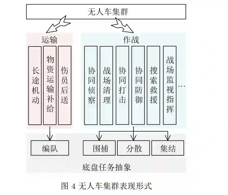 集群是一种仿生学概念,从自然界中的自发组织如鸟群、鱼群[1]、蚁群[2]和狼群[3]等集群中获取灵感。集群不是传统人工智能中的模仿个体结构,而是对群体结构和交互方式的模仿。在集群中,个体视为具有简单和单一功能的智能体,而某些个体具备自我进化的能力,以实现更好的兼容性,为集群行为奠定基础。 在过去的20年里,随着无人车技术的迅猛发展,多辆无人车之间可以通过无线通信或车载传感器感知的方式进行信息交流和行动协同,从而形成多种形式的多无人车联合运用,展现出比单车更强大的能力,实现更多的功能。这种系统被称为无人车集群系统或多无人车系统[4]。 无人车集群运用是智能无人领域未来发展的主要方向,原因如下: 一是技术的快速发展为无人车集群运用提供了基础支持。通信技术,特别是高性能的自组网通信技术,保证了集群系统之间可靠的信息交互。芯片和软件技术的进步提升了无人车的环境感知和认知能力,使其更适应复杂的集群协同要求。大型模型(如chatGPT)的应用提高了人工智能(Artificial Intelligence, AI)的推理决策能力,满足了战场快速集群协同的需求。 二是无人车成本的快速下降使得大规模集群运用在经济上成为可能。随着自动化控制技术的成熟和完善,无人车的制造、装配、维护保养以及机器学习算法的开发维护等成本逐渐降低。尤其是近年来机器学习技术的进步,有效地降低了人工参与的成本。 此外,追求战场人员零伤亡是推动无人车集群运用的重要动力。未来战争可能面临高强度的军事行动,因此保障人员生命安全成为重要目标。无人车集群的应用可以实现军事任务的自动化和智能化,降低对人员的依赖性和风险。例如,无人车集群可以自主完成侦察、探测、攻击等任务,为士兵提供更安全的环境,避免不必要的人员伤亡。另外,无人车集群还可以提供精确的军事物流支持,包括弹药和补给物资的运输以及伤员的运送等。 目前无人车集群系统研究领域异常活跃。从仿生角度研究集群系统组织形式[5],从鲁棒高效通信角度研究集群中车间信息交互方式[6],从车车关系角度研究集群系统架构特点[7]等等,均进行了深入研究。另外联合制图、协同搜索[8]、协同任务分配、协同路径规划、协同控制[9]等多个研究方向也进展明显。 无人车集群在国防军事上应用非常广泛。主要应用场景包括监视[10]、搜索和探索[11]、协同侦察[12]、环境监测[13]、协同操控[14]、协同围捕等等。 在监视及侦察任务过程中,通过搭载各种传感设备(红外相机、雷达等),无人车集群可实现对目标区域高精度、高分辨率的观测;另外,无人车集群与其他军事技术(无人机、卫星等)相配合,实现对目标区域的全面覆盖和多角度观测。在环境监测任务中,无人车集群能够监控和分析目标区域的环境因素(大气环境、水质环境、地质环境等),并可在复杂和危险环境中执行任务,提高军事情报获取的时效性和准确性。协同操控是无人车集群通过网络连接实现对系统中各无人车的实时监控和控制,包括无人车的动作、角度、速度等实时状态调整,确保无人车协同运行。协同操控是无人车集群完成各种任务的基础。 协同围捕是搜索、侦察、操控等应用的集成,旨在通过各无人车协同实现对目标的围捕和控制。协同围捕通过先进的自主控制技术,对集群中各无人车的状态进行实时监测及控制;通过搭载的各传感设备,无人车对目标进行侦察及监视,确定目标的位置和行动路线,实现对目标的追踪和围堵。协同围捕的具体应用包括打击、拦截敌方战术车辆和零散人员等,可以显著提高军事作战的效率和准确性,减少人员伤亡,大幅度提升安全性能。 本文从无人车集群的架构入手,重点讨论围捕过程中的策略机理以及所采用的方法策略,总结现阶段围捕所面临的挑战及发展方向。