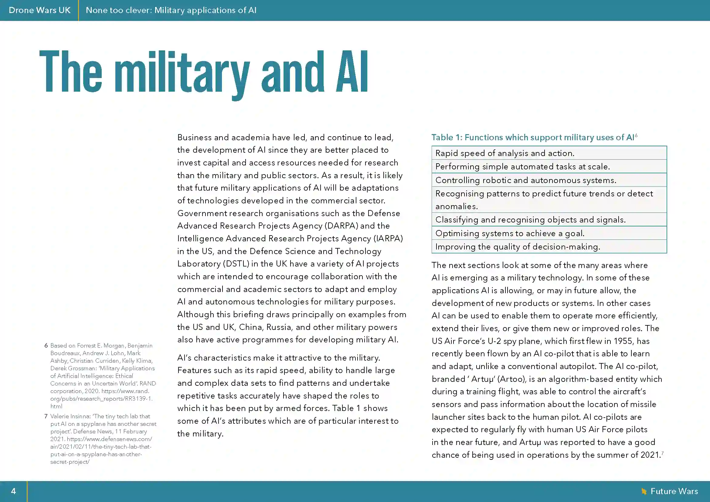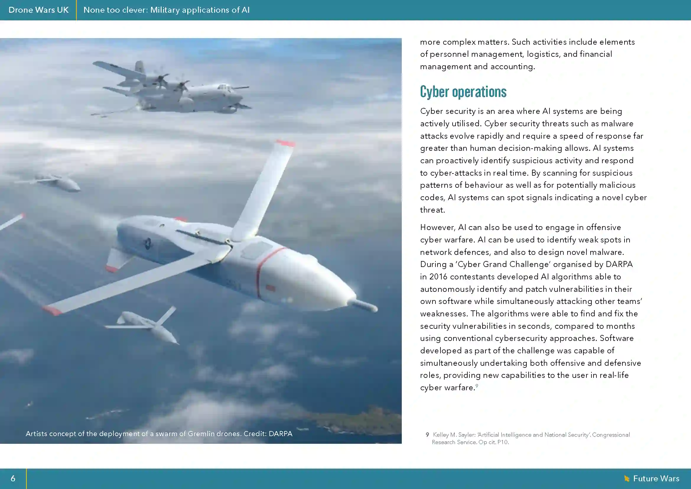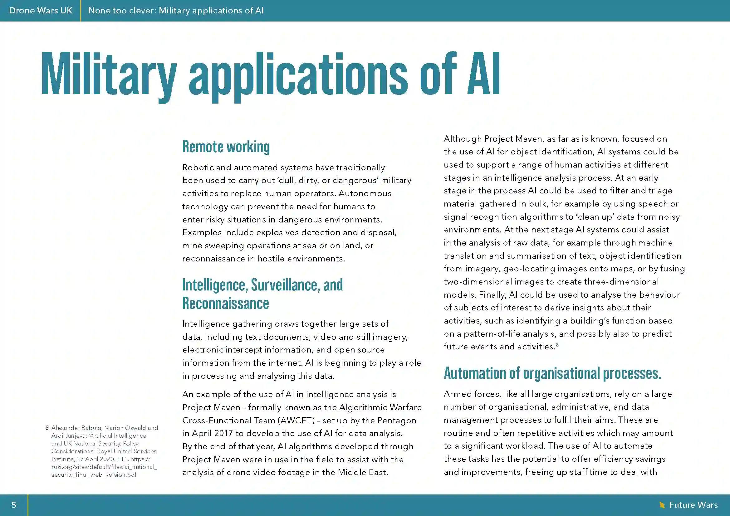 Drone Wars UK 的最新简报着眼于人工智能目前在军事环境中的应用方式,并考虑了所带来的法律和道德、作战和战略风险。