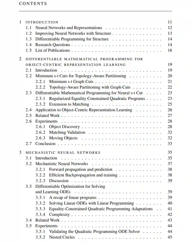 **研究问题2 神经网络如何生成明确的、可解释的、可分析的动态机制来管理网络自身的内部动态演化? **在第3章中,我们提出了一类新的动态模型,称为机械神经网络,它们生成作为一组线性常微分方程(ODEs)的明确内部机制,进而管理内部神经网络表示的演化。网络表示的演化是通过解生成的ODEs来计算的。我们展示了可微分优化也可以用来在神经网络内部有效地解线性ODEs,同时允许相对于ODE参数计算梯度。该模型可以应用于动态数据以及图像等其他类型的数据,并且在其他神经网络动态系统模型上有所改进。尽管机制是内部神经网络表示的一部分,它们也是明确的,这意味着它们可以被理论和实验分析所研究。接下来,我们探讨具有子集操作的神经网络作为离散结构的下一个示例。作为应用,我们考虑解释性和子采样大图像的任务。在这两种情况下,问题是是否可以选择输入数据示例的一个子集,以某种方式代表原始输入。在解释性任务中,选择的子集是逐实例解释预测的。在子采样任务中,选择的子集是逐数据集的,并且可以看作是原始数据集的替代。以前的方法通常限于小的子集和领域大小。我们的下一个研究问题探索这个任务是否可以快速有效地完成,对于大领域和子集大小。
