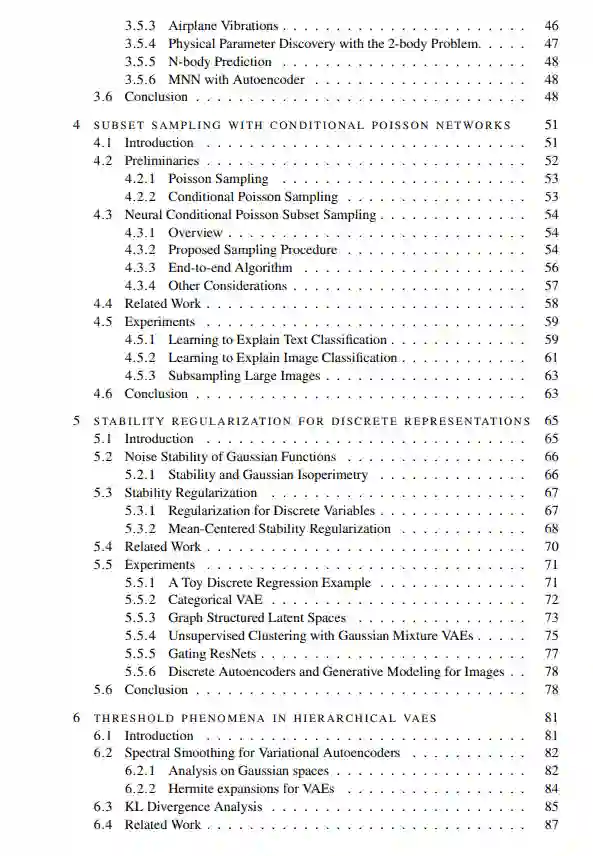 **研究问题4 高斯函数稳定性是否为训练具有离散变量的神经网络提供了一种可行的方法? **在第5章中,我们检查了使用高斯函数稳定性概念作为训练具有离散变量的神经网络的正则化方法。用于学习具有离散变量的网络的放松方法依赖于手动温度调整,因为网络没有指导性激励去获得离散表示。这项工作提出了一种正则化方法,其中放松的程度作为稳定性项包含在损失函数中。粗略地说,高斯函数的噪声稳定性是衡量其对噪声的抵抗力的度量。Borell的等周定理(Borell, 1985)指出,对于某个固定体积的有界函数,其范围为[0, 1],噪声稳定性由半空间的指示函数最大化。鉴于半空间指示符在高斯空间中最大化噪声稳定性,我们通过优化稳定性作为将高斯输入转换为二进制向量的简单有效方法来开发我们的方法。在最后一章中,我们从高斯函数的谐波分析的角度考虑了一个层次模型,层次变分自编码器。