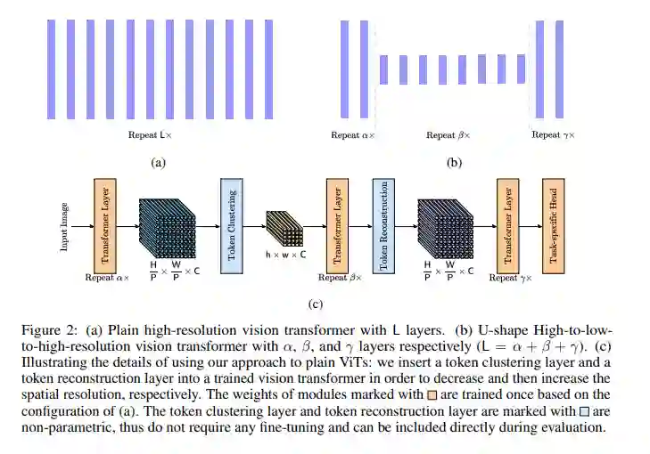 视觉transformer最近在各种视觉任务中取得了有竞争力的结果,但在处理大量token时仍然存在很大的计算成本。许多先进的方法已经开发出来,以减少大规模视觉transformer中的token总数,特别是对于图像分类任务。通常,他们根据与 [class]标记的相关性选择一组基本标记,然后微调视觉transformer的权重。这种微调对于密集预测来说不太实用,因为与图像分类相比,计算量和GPU内存成本要高得多。在本文中,我们关注一个更具挑战性的问题,即在不进行任何额外的再训练或微调的情况下,加速大规模视觉transformer进行密集预测。针对高密度预测需要高分辨率表示的事实,我们提出了两个非参数运算符,一个是减少token数量的token聚类层,一个是增加token数量的token重构层。为了实现这一目标,我们执行了以下步骤:(i)我们使用token聚类层将相邻的token聚在一起,从而产生保持空间结构的低分辨率表示;(ii)仅将以下transformer层应用于这些低分辨率表示或集群token;(iii)我们使用token重构层从精炼的低分辨率表示重新创建高分辨率表示。该方法在目标检测、语义分割、泛视分割、实例分割和深度估计等五种密集预测任务中取得了良好的效果。因此,该方法在不微调官方权重的情况下,在ADE20K上保持99.5%的性能的同时,加速了40%↑FPS并节省了30%↓GFLOPs的“Segmenter+ViT-L/16”。 https://www.zhuanzhi.ai/paper/d7612e394722b9aa764f35a645789efe