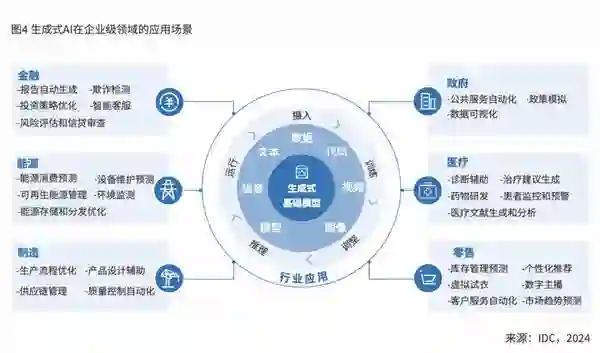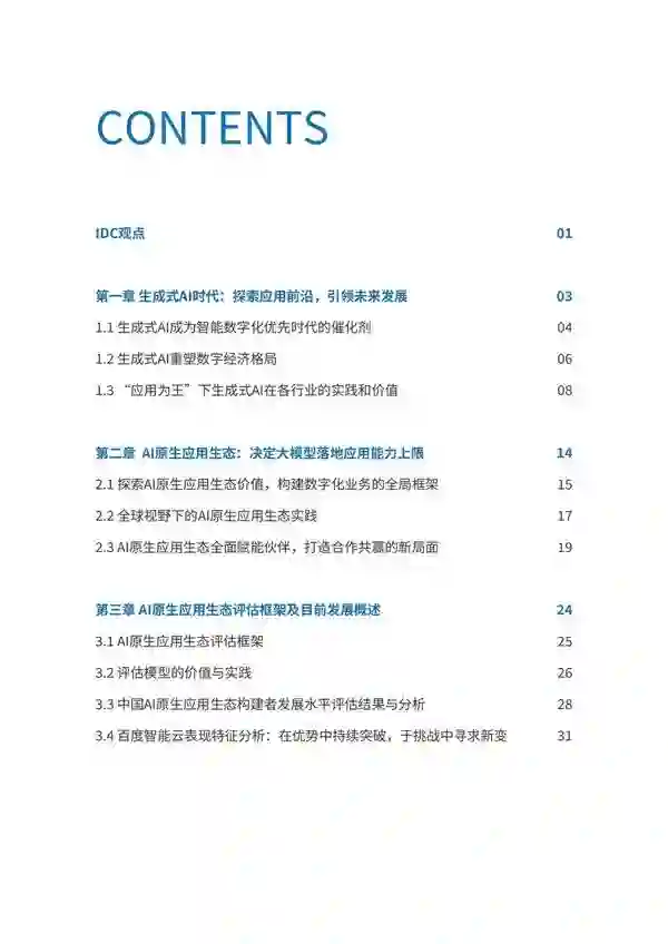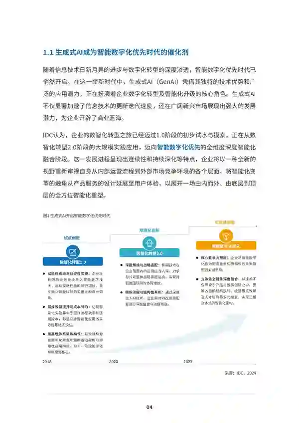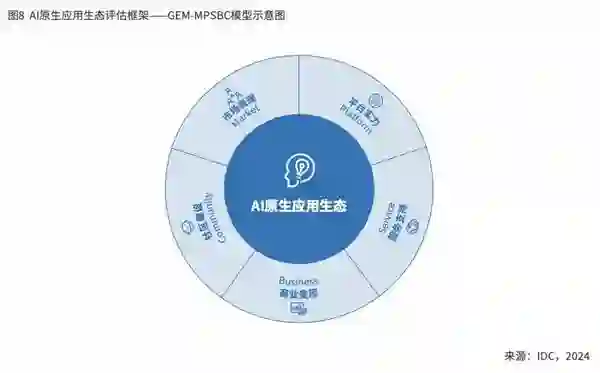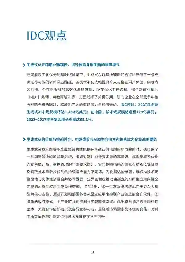 生成式AI的价值与挑战并存,构建或参与AI原生应用生态体系成为企业战略要务 生成式AI技术在赋予企业显著的效能提升与商业价值创造能力的同时,也带来了一系列待解决的风险与挑战,诸如对高性能计算资源的高需求、模型部署及优化的复杂度升高、数据管理的严谨要求提升、安全保障措施的周密布局难以保证以及紧跟技术革新步伐的的持续适应能力不足等。 为化解这些难题,确保AI技术更稳健地与实体经济融合并协同发展,业界正积极推动由孤立的AI原生应用向健全完善的AI原生应用生态系统转型。 IDC指出,这一生态系统的核心在于以AI大模型为核心支柱,通过开发和部署各类AI原生应用来串联产业链上的合作伙伴,创造新的服务模式,全产业链共同挖掘并实现商业潜能。 此生态系统涵盖生态构建主体、关键合作创新者以及各行业参与者,且随着市场需求及环境的变化,对其中所有角色的功能定位和技术要求也在不断提升: 生态构建者须开放包容,与伙伴共筑协同繁荣之路:生态构建者在系统中发挥着核心作用,在生成式AI时代下需展现出更为开放包容的姿态,积极倡导并鼓励各合作伙伴及客户间形成紧密协同效应,各自发挥核心优势,共同砥砺前行,推动AI原生应用生态系统的繁盛壮大。 生态关键共创者须深思定位,深化合作以推动AI应用革新:生态关键共创者是生态系统中的重要合作伙伴,其角色定位不应止步于简单的“信息传递者”,而应深入挖掘自身潜力,进行战略性的思考与革新。通过与生态系统内部其他伙伴开展深度合作和资源共享,多方合力促进AI原生应用领域的深化拓展和技术进步,实现互惠互利的长远发展目标。