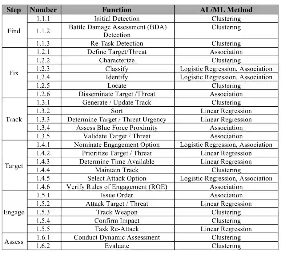 现代战斗空间由来自常规陆地、空中和海洋等多个领域以及来自太空和网络空间的大量数据组成。决策者需要考虑许多因素,包括交战规则 (ROE)、要使用的武器、传感器和意图评估。发现、修复、跟踪、瞄准、参与、评估 (F2T2EA) 杀伤链模型缓解了该过程的一些困难(参谋长联席会议,2013 年)。人工智能 (AI) 和机器学习 (ML) 可以通过分析备选方案和使用评估标准将 AI 方法映射到杀伤链功能,从而帮助海军在战术领域做出杀伤链决策。这是在本报告的五个章节中分三个阶段完成的。