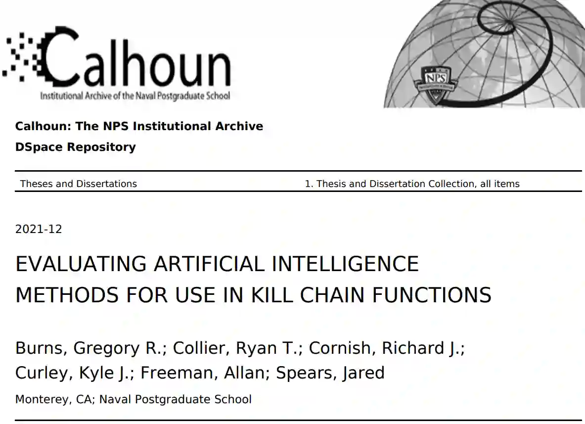 该项目探索了使用自动化和人工智能 (AI) 来改进海军杀伤链决策。该团队研究了海军杀伤链功能,并为每个功能制定了特定的评估标准,以确定特定 AI 方法的功效。该团队确定并研究了 AI 方法,并应用评估标准将特定的 AI 方法映射到特定的杀伤链功能。