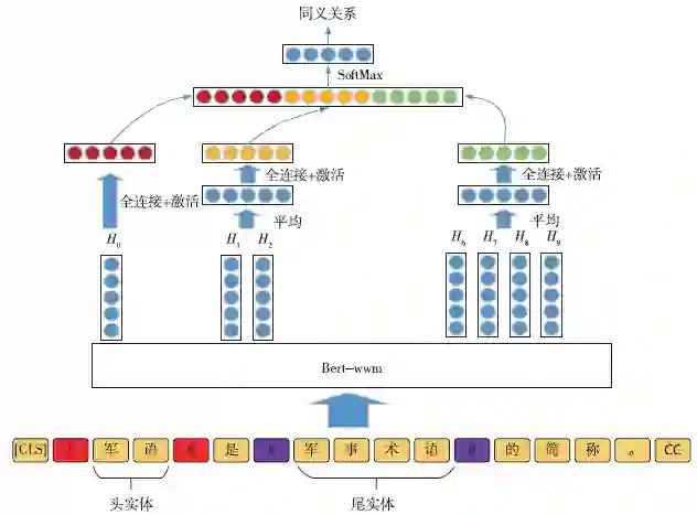为能高效预测军事术语之间的关系,本文采用R-Bert的方法抽取军事术语关系。首先对数据中的军事术语实体信息使用Bert-wwm预训练模型对军事术语数据进行编码,然后将Bert-wwm输出的向量信息中的头实体和尾实体的向量进行平均,再进行激活和全连接操作得到最终的表示向量,公式如(1)和(2)所示。