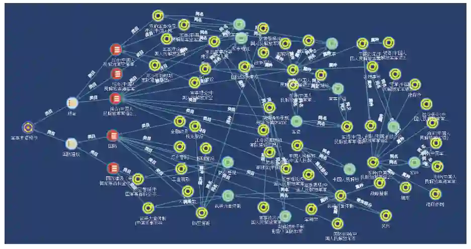 基于规则的方法构建了一个高质量的军事术语关系三元组数据集,并为军事术语关系抽取模型提供了训练数据。但是,基于规则的方法需要大量的人工构建规则,难以抽取更丰富的军事术语关系。基于预训练模型的方法抽取军事术语关系的准确率达到94.11%,基本达到了基于规则的方法的准确率。采用基于预训练模型的方法进一步处理军事术语原始数据,能够高效地抽取军事术语关系信息,与基于规则的抽取方法形成有效互补。 4 知识图谱存储与可视化****