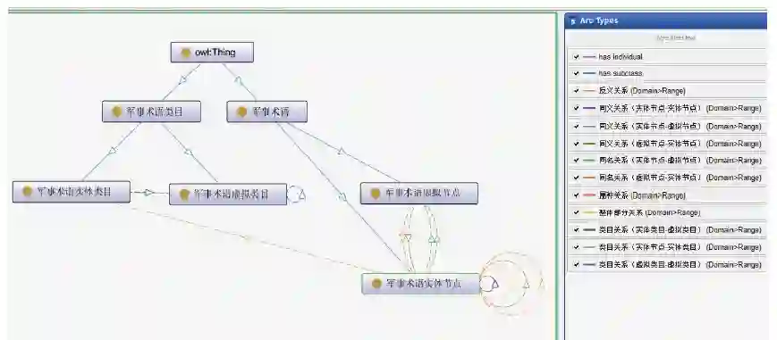 本体论源于一个哲学上的概念,是表达哲学理论的一个术语。本体是指对概念、数据和实体之间的类别、属性和关系的表示、命名和定义。Studer等人将本体定义为本体是共享概念模型的明确的形式化规范说明。该定义覆盖了本体的四大特征:共享、明确、概念化和形式化,该定义被各个领域的专家学者高度认可。通常,本体可以采用一个五元组进行表示,即O=(C, R, F, A, I)。C表示本体当中的概念,本体中的概念可以是广义上的概念,也可以是一般意义上的概念。本体中的概念通常构成一个分类层次,例如军事术语本体当中的军事思想概念、军事战略概念;R表示本体中概念之间的一种关联关系,例如军事术语的同义词是军语;F表示函数,它是本体中一种特殊的关系;A表示公理,它用于表示本体中的永真式;I表示某个概念的基本元素,即某概念类所指的具体实体,例如军事术语、陆军战略。