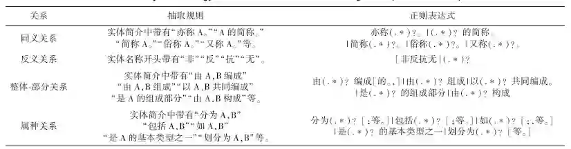 表1 军事术语关系抽取规则及正则表达式示例