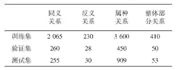军事术语关系抽取模型的结构如图3所示。 图3 军事术语关系抽取模型 3) 结果分析 基于规则的方法抽取出军事术语关系的数据集分布如表2所示。为训练军事术语关系抽取模型,本文把军事术语训练数据按照8:1:1的比例划分为训练集、验证集和测试集。训练集和验证集用于训练军事术语关系抽取模型。模型的训练采用Adam优化器,设定初始学习率为1×10-4,dropout率设置为0.1,Batch-Size大小设置为16,并对关系抽取的目标函数进行优化,微调出军事术语关系抽取模型。最终,经过测试,军事术语关系抽取模型的准确率为94.11%,召回率为93.95%,F1值为94.03%。 表2 军事术语数据集分布