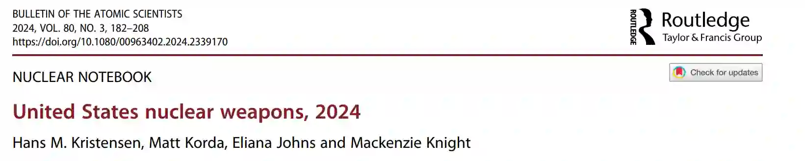 美国已开始实施一项范围广泛的核现代化计划,在未来几十年中,所有核运载系统最终都将被更新换代。在本期《核笔记本》中,我们估计美国的核弹头储备量约为 3708 枚--与前一年的估计值持平。其中,只有约 1770 枚弹头已部署,约 1938 枚处于储备状态。此外,约有 1,336 枚退役弹头正等待拆除,因此核弹头库存总量约为 5,044 枚。在已部署的约 1,770 枚弹头中,400 枚位于陆基洲际弹道导弹上,约 970 枚位于潜射弹道导弹上,300 枚位于美国的轰炸机基地,约 100 枚战术炸弹位于欧洲基地。《核笔记本》由美国科学家联合会核信息项目的工作人员:主任汉斯-M-克里斯滕森(Hans M. Kristensen)、高级研究员马特-科尔达(Matt Korda)、助理研究员伊莱安娜-约翰斯(Eliana Johns)和项目助理麦肯齐-奈特(Mackenzie Knight)负责研究和撰写。