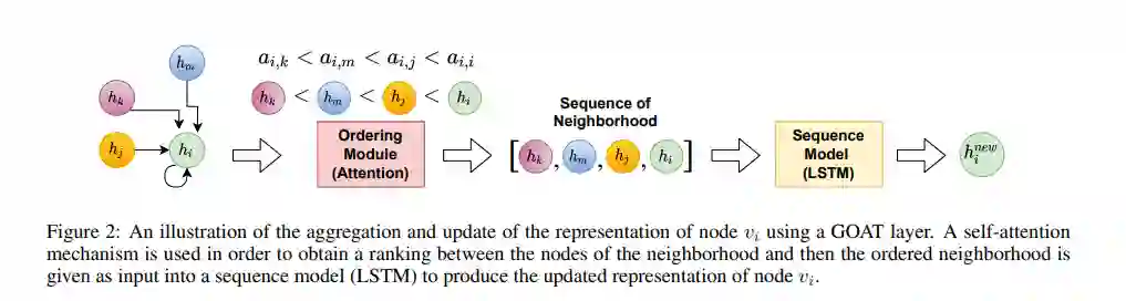 图神经网络(GNNs)已经成功地用于许多涉及图结构数据的问题,实现了最先进的性能。GNN通常采用消息传递方案,其中每个节点使用置换不变聚合函数从其邻居聚合信息。经过严格检查的标准选择(如平均值或和聚合函数)功能有限,因为它们无法捕获相邻函数之间的交互。在这项工作中,我们使用一个信息理论框架来形式化这些交互作用,特别是包括协同信息。在此定义的驱动下,我们引入了图排序注意力层(GOAT),这是一种新颖的GNN组件,用于捕获邻域节点之间的交互。这是通过一种注意力机制来学习局部节点顺序,并使用循环神经网络聚合器处理有序表示来实现的。这种设计允许我们使用一个排列敏感的聚合器,同时保持拟议的GOAT层的排列等效。GOAT模型展示了它在捕获复杂信息的图指标(如中间性中心性和节点的有效大小)建模方面提高的性能。在实际用例中,通过在几个真实的节点分类基准测试中取得的成功,它的卓越建模能力得到了证实。