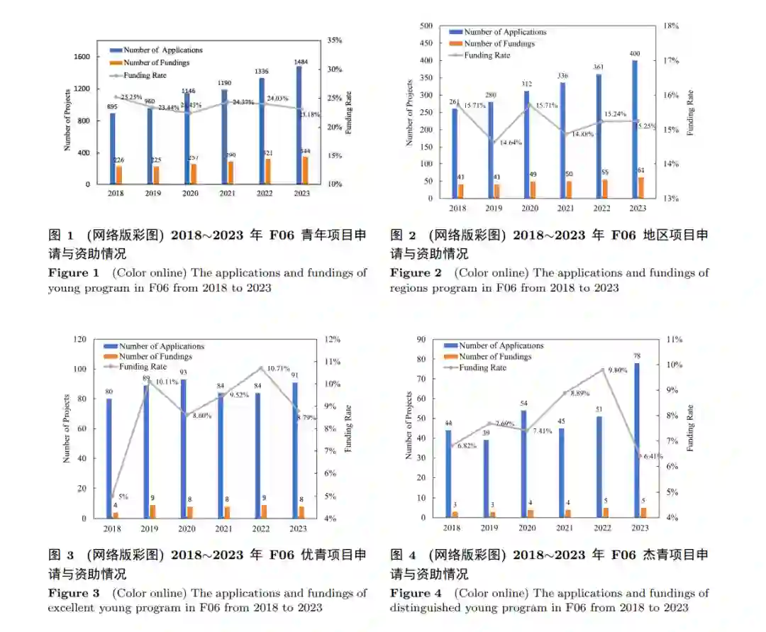 (优青项目) 以及国家杰出青年科学基金项目 (简称杰青项目) 等人才项目的申请和资助情况,同时从 信息二处人工智能学科 (F06) 及计算机学科 (F02) 青年项目和面上项目依托单位变更以及 F06 获批 优青项目和杰青项目申请人的人才单位变化角度分析了人工智能领域人才流动情况. 2018∼2023 年, 自然科学基金委信息科学部人工智能学科 (F06) 青年项目、地区项目、优青项目 和杰青项目的总体申请与资助情况如图 1∼4 所示. F06 代码设立以来, 四类人才项目在申请数量方面, 青年项目、地区项目申请数量增长趋势明显, 呈逐年上升趋势, 优青项目和杰青项目申请数量存在一定程度的波动, 优青项目申请数量最多为 2023 年度的 91 项, 杰青项目最多为 2023 年的 78 项, 优青项目和杰青项目近三年整体呈现出增长的趋势. 2023 年度, 青年项目、地区项目、优青项目和杰青项目四类人才项目相较于上一年度, 申请数量的涨 幅分别为 11.08%, 10.80%, 8.33% 和 52.94%. 在资助数量方面, 青年项目和地区项目资助数量呈现出稳定增长趋势. 相较上一年度, 2023 年青 年项目资助数量涨幅为 7.17%, 地区项目资助数量涨幅为 10.91%, 但在资助率上青年项目近三年来呈现出下降趋势, 2018 年资助率最高为 25.25%, 2023 年资助率最低为 23.18%, 地区项目资助率最高为 15.71%, 最低为 14.64%. 优青项目在 2018 年资助数量最少为 3 项, 近五年来资助数量相对平稳, 最 高资助数量为 9 项, 最低资助数量为 8 项, 2018 年优青项目资助率最低为 5%, 2022 年资助率最高为 10.71%. 杰青项目资助数量呈现稳中有升的态势, 2018 年和 2019 年资助数量均为 3 项, 2022 年和 2023 年资助数量均为 5 项, 2022 年杰青项目资助率最高为 9.8%, 2023 年资助率最低为 6.41%. 整体来看, 除地区项目外, 其他三类人才项目的申请数量涨幅均大于资助数量涨幅, 竞争程度均有一定的提升, 其 中优青项目和杰青项目两类人才项目的竞争度增加较为显著. 2023 年度除地区项目外的其他三类人 才项目的资助率较前一年度均有所下降, 青年项目、优青项目以及杰青项目分别降低 0.85%, 1.92% 和 3.39%. 此外, 表 1 统计了 2021∼2023 年 F06 各二级代码使用频次排名前三的关键词. 从关键词统计分 析来看, 深度学习是人工智能各二级代码研究方向中的重要技术手段, 大部分二级代码的关键词频次 虽然存在一定波动, 但关键词基本较为稳定. F0601 及 F0602 作为人工智能的基础研究代码, 对神经 网络的研究是近三年来关注的热点方向. 分类、聚类等任务是 F0603、F0605 两个二级代码中的主要 研究内容. 多模态是 F0604、F0606、F0607 等方向下研究的主要方向. F0608 持续推进隐私保护和智 能系统的技术研究. F0609 主要是脑机接口和脑电的技术研究. 从 F0610 的关键词使用频次可见, 深度 学习已成为解决交叉科学问题中的主要技术手段. 从总体来看, F06 资助项目紧跟国际前沿, 如多模 态是目前大模型的主要技术之一, 机器翻译是大语言模型的重要任务之一, 联邦学习是人工智能安全 的重要技术之一等. 图 5 展示了 2018∼2023 年青年项目、地区项目、优青项目、杰青项目的平均申请年龄以及平均资 助年龄. 横向对比四类人才项目, 青年项目、地区项目的平均申请年龄均高于平均资助年龄, 青年项 目的平均申请年龄为 34 岁, 平均资助年龄 31 岁, 地区项目的平均申请年龄为 43 岁, 平均资助年龄为 42 岁, 优青项目和杰青项目的平均申请年龄和平均资助年龄基本持平, 优青项目为 36 岁, 杰青项目为 41 岁. 图 6 展示了 2018∼2023 年 F06 代码下四类人才项目男女平均申请数量和资助率. 四类人才项 目的男性申请人数均远多于女性申请人数, 但在资助率方面, 除杰青项目外, 男性资助率均高于女性 资助率, 杰青项目男性资助率为 7.42%, 女性资助率为 10.71%. 在青年项目上, 男女资助率差异最为显 著, 男性资助率为 28.73%, 女性资助率为 17.07%.