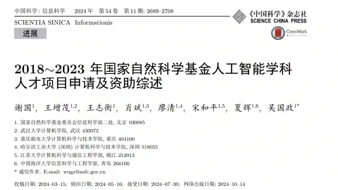 围绕国家自然科学基金委信息科学部人工智能学科(F06) 2018∼∼2023年青年科学基金项目、地区科学基金项目、优秀青年科学基金项目以及国家杰出青年科学基金项目等人才项目的申请及资助情况, 从学科领域分布、申请年龄性别、依托单位分布以及依托单位变更情况等角度进行了分析, 为人工智能领域的人才队伍建设、学科发展布局提供参考. https://www.sciengine.com/SSI/doi/10.1360/SSI-2024-0080