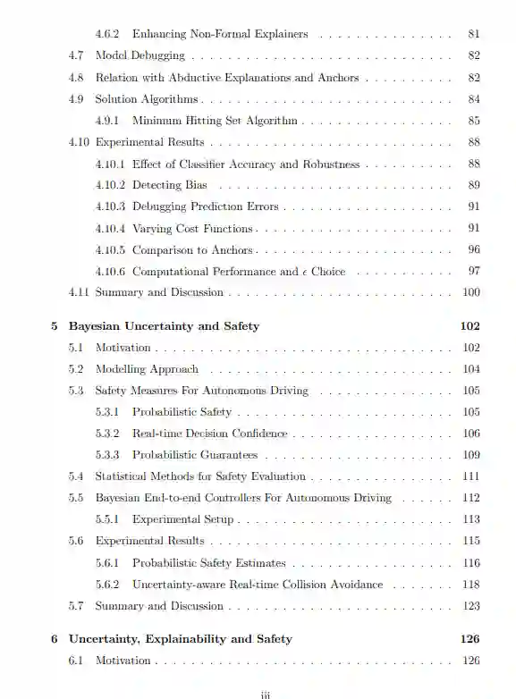 我们的第二篇文章关注的是一个自动驾驶场景,该场景由基于Carla模拟器数据训练的端到端贝叶斯神经网络(BNN)控制器实现。BNN能够捕捉学习模型中的不确定性,同时保留神经网络固有的主要优势。我们提出了两种方法来评估在离线和在线设置中存在不确定性的BNN控制器的决策安全性。我们开发了一种技术,在给定的标准下近似整个系统的安全边界,具有高概率和先验统计保证。我们最后的贡献是结合贝叶斯神经网络的不确定性信息和局部解释方法的方法集合。展示了如何制定现有特征评分解释方法的贝叶斯版本,以及矿石的贝叶斯版本,称为贝叶斯最优鲁棒解释(B-OREs)。我们定义了一个覆盖解释,它将由多个BNN后验样本产生的信息浓缩为一个单一的解释,该解释的可能性是一个随机样本的解释。在贝叶斯最优鲁棒覆盖解释的情况下,我们获得了解释暗示预测的可能性的概率。我们将贝叶斯覆盖解释与特征不确定性的概念结合起来,对覆盖解释中出现的每个特征进行重要性排序,并表明特征不确定性可以用于提供模型与每个类关联最多的输入特征的全局概述。