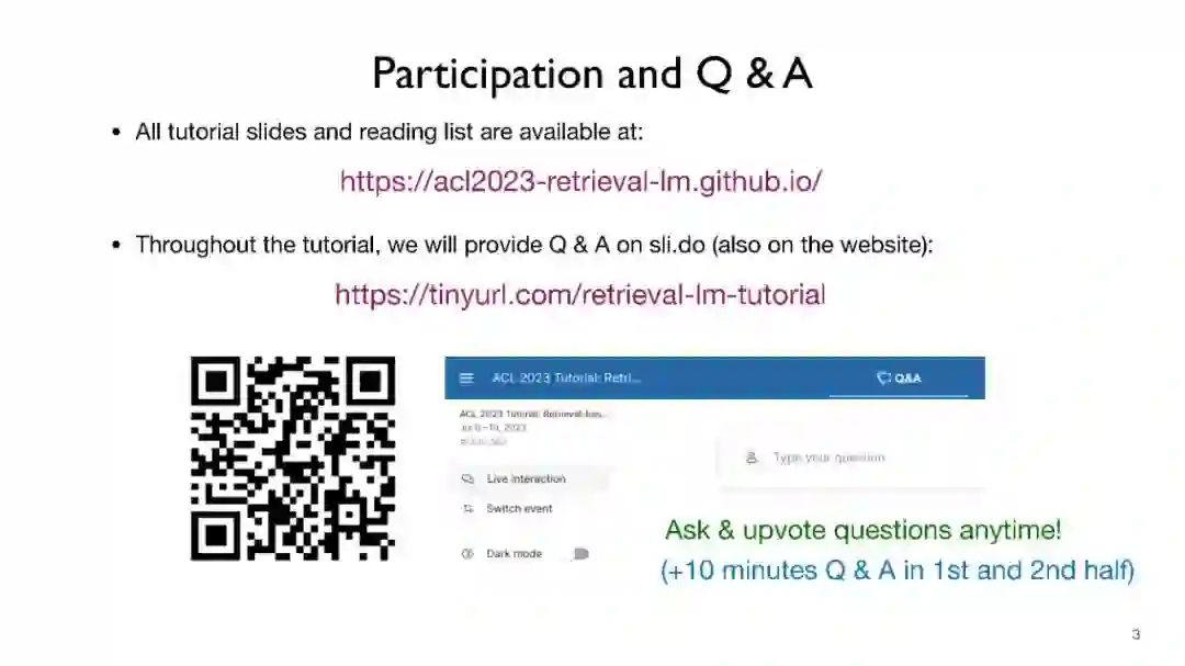 像GPT-3 (Brown等,2020) 和 PaLM (Chowdhery等,2022) 这样的语言模型(LMs)在一系列自然语言处理(NLP)任务中展示出了令人印象深刻的能力。然而,仅依赖它们的参数来编码世界知识需要过于庞大的参数数量,从而导致大量的计算,它们往往在学习长期知识方面存在困难(Roberts等,2020;Kandpal等,2022;Mallen等,2022)。此外,这些参数化的LMs从根本上无法随时间的推移进行适应(De Cao等,2021;Lazaridou等,2021;Kasai等,2022),经常会产生幻觉(Shuster等,2021),并可能从训练语料库中泄漏私人数据(Carlini等,2021)。为了克服这些限制,人们对基于检索的LMs(Guu等,2020;Khandelwal等,2020;Borgeaud等,2022;Zhong等,2022;Izacard等,2022b;Min等,2022)产生了越来越大的兴趣,这些模型将非参数化的数据存储(例如,来自外部语料库的文本块)与他们的参数化版本结合在一起。基于检索的LMs可以以更少的参数大幅度超越没有检索的LMs(Mallen等,2022),可以通过替换检索语料库来更新他们的知识(Izacard等,2022b),并且为用户提供引文以便于轻松验证和评估预测(Menick等,2022;Bohnet等,2022)。过去,检索和LMs大多被分开研究,只是最近研究者们才将他们集成起来,构建了在其中检索和LMs更有机地互动的系统,由于兴趣的增长,已经提出了一些基于检索的LMs。他们在神经架构(例如,检索单元的粒度,如何整合检索到的信息)、学习算法和在下游应用中的不同使用等方面存在差异。在这个教程中,我们的目标是提供关于基于检索的LMs最近进展的全面而连贯的概述。我们将首先提供基础知识,涵盖LMs(例如,掩码LMs,自回归LMs)和检索系统(例如,广泛用于神经检索系统的最近邻搜索方法;Karpukhin等,2020)的基础。然后我们将关注基于检索的LMs在架构,学习方法和应用方面的最近进展。