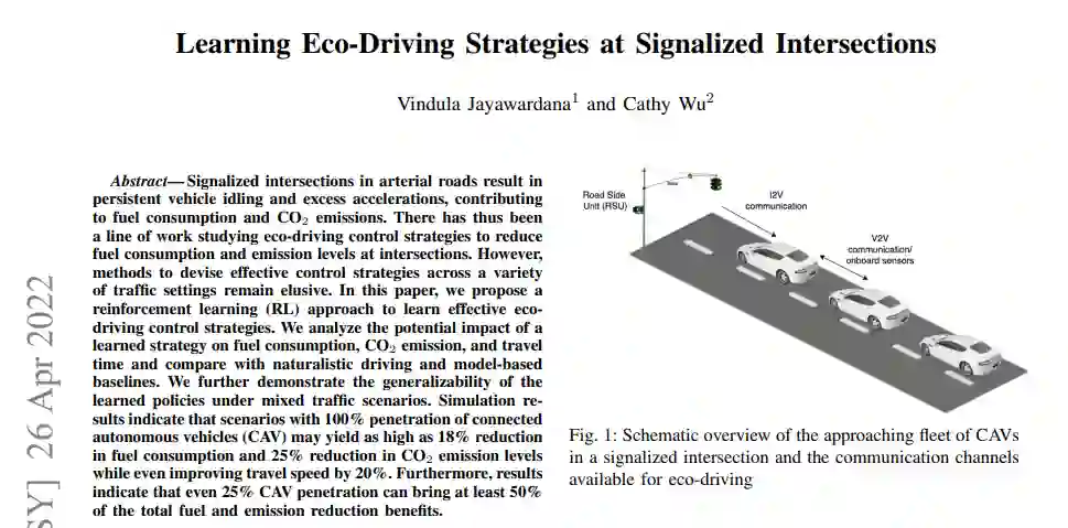 主干道上的信号交叉口导致车辆持续空转和过度加速,造成燃油消耗和二氧化碳排放。因此,已经有一系列的工作在研究生态驾驶控制策略,以减少交叉口的燃料消耗和排放水平。然而,在各种交通环境中设计有效的控制策略的方法仍然难以实现。在本文中,我们提出了一种强化学习(RL)方法来学习有效的生态驾驶控制策略。我们分析了所学策略对燃料消耗、二氧化碳排放和旅行时间的潜在影响,并与自然驾驶和基于模型的基线进行比较。我们进一步证明了在混合交通情况下所学策略的普遍性。仿真结果表明,在联网自动驾驶汽车(CAV)100%渗透的情况下,燃料消耗量可减少18%,二氧化碳排放水平可减少25%,同时行驶速度甚至提高20%。此外,结果表明,即使是25%的CAV渗透率也能带来至少50%的总燃料和排放减少效益。