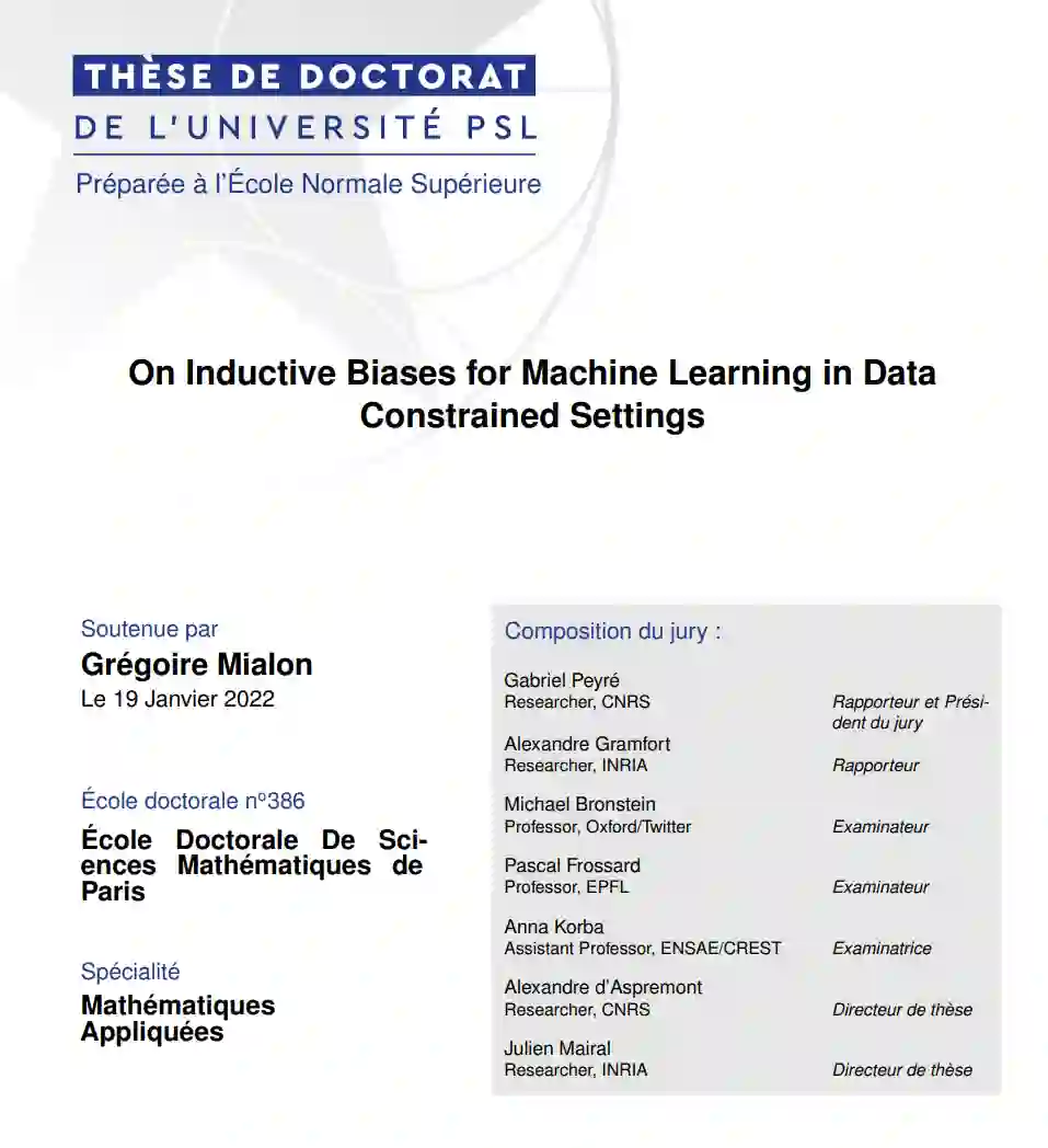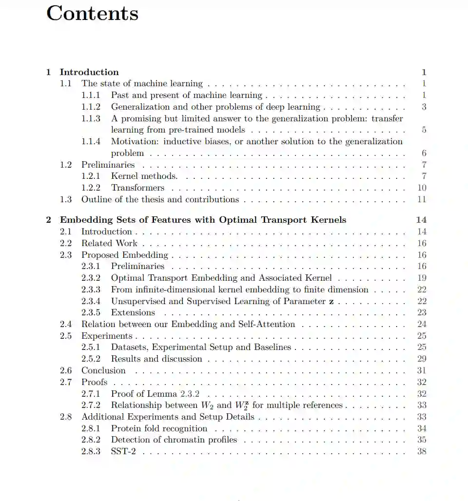 利用有限的数据进行学习是深度学习的最大问题之一。目前,解决这个问题的流行方法是在大量数据上训练模型,无论是否标记,然后在同一模态的感兴趣的较小数据集上重新训练模型。直观地说,这种技术允许模型首先学习某种数据(如图像)的一般表示。然后,学习这种特定模态的特定任务应该需要更少的数据。虽然这种被称为“迁移学习”的方法在计算机视觉或自然语言处理等领域非常有效,但它不能解决深度学习的常见问题,如模型可解释性或对数据的总体需求。本文探索了在数据约束设置中学习表达模型问题的不同答案。我们不再依赖大数据集来学习神经网络的参数,而是用反映数据结构的已知函数来代替其中的一些参数。这些函数通常都是从内核方法的丰富文献中提取出来的。实际上,许多核函数都可以解释,并且/或允许使用少量数据进行学习。所提出方法属于"归纳偏差"的范畴,可以定义为对手头数据的假设,限制了学习过程中模型探索的空间。在本文的前两章中,我们在序列(如自然语言中的句子或蛋白质序列)和图(如分子)的上下文中证明了该方法的有效性。本文还强调了工作与深度学习最新进展之间的关系。本文的最后一章重点研究凸机器学习模型。这里,我们不是提出新的模型,而是想知道学习一个“好的”模型真正需要数据集中的哪些样本比例。更准确地说,研究了安全样本筛选的问题,即在拟合机器学习模型之前,执行简单测试以丢弃数据集中没有信息的样本,而不影响最优模型。此类技术可用于压缩数据集或挖掘稀有样本。
