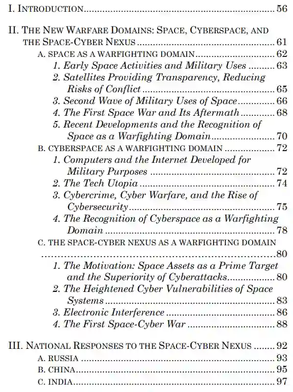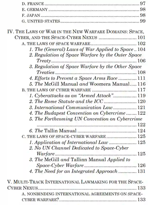 下文第二节回顾了太空--最初保留用于和平目的--作为一个作战领域的出现,网络空间作为一个作战领域的出现,以及最终太空-网络关系作为一个作战领域的出现。然后,第三节回顾了各国正在采取的应对太空-网络关系的措施,包括针对脆弱性和风险出台政策和标准。在讨论国家应对措施之后,将讨论国际层面的应对措施。第四节讨论了太空、网络空间和太空-网络关系等新战争领域的战争法,表明迫切需要采取综合的多边制度。第五节紧随其后,提出多轨国际立法是为太空-网络战争领域引入多边规范和规则的可行途径。这强调了一种多中心的方法,包括多个部分重叠的论坛(包括多方利益攸关方论坛),并主要介绍了不具约束力的国际协定和其他文书,总体而言,这些协定和文书有助于达成共识和建立规范。第六节总结了本文的主要观点。