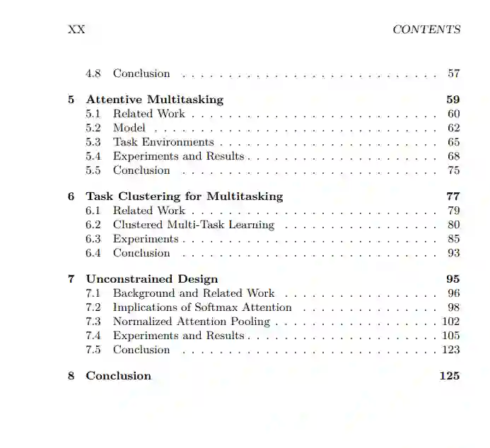特别地,本文首先强调了反向传播的隐式内存需求、常用激活函数的工作范围以及体系结构组件对梯度传播的影响。展示了架构瓶颈和门控机制如何导致梯度消失,并讨论了残差连接对梯度动态的影响。它还强调了通过体系结构提供算法结构的必要性,以及结构和有利的训练动态之间的内在权衡。在第一个实际示例中,本文提出了一种全连接层的稀疏替代方案,可以减少参数计数,而不会引入不必要的瓶颈。在强化学习方面,本文提出了一种在连续动作空间环境中控制的新方法。该方法基于分位数回归和神经网络的单调性约束。这种组合允许在网络参数中隐式地表示策略,从而提供了表示复杂动作分布的灵活性。这种策略的必要性在竞争游戏和约束内存设置中得到了证明。此外,该方法还提高了经典控制问题的学习性能。本文进一步探讨了多任务学习的局限性,并针对干扰任务目标的问题提出了两种解决方案——一种是基于注意力架构先验的解决方案,另一种是基于与无监督任务聚类配对的神经网络解决方案。这两种方法都有效地缓解了这个问题,从而提高了性能,并在不同的环境中具有更广泛的适用性。 本文最后深入研究了注意力架构和transformer对超参数的敏感性。它强调了将注意力权重约束到概率单形的含义,以及这些如何反映训练表现。它进一步展示了内部softmax激活如何像sigmoid一样容易饱和,以及transformer在初始化时如何不是序列长度独立的。在对抽象任务的大规模实证研究中,将Transformer与可选架构设计进行比较。结果突出了超参数选择的相关效应,不同架构对数据偏差的鲁棒性,以及算法对齐对底层任务的重要性。