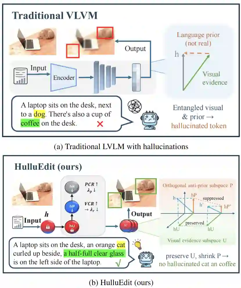 研究背景 多模态大语言模型(LVLMs)在图像描述和视觉问答中展现了卓越能力 。然而,模型仍面临严峻的物体幻觉挑战,即在生成文本时描述图像中不存在的对象、属性或关系 。这种现象通常源于强大的“语言先验”覆盖了较弱或模糊的“视觉证据”,导致生成内容与实际图像脱节。 如图1所示,现有方法在处理幻觉时面临以下核心挑战:1. 效率与精度的失衡:对比解码(Contrastive Decoding)等方法通常需要昂贵的参考模型或多次前向传播,增加了推理延迟 。2. 静态编辑的局限性:静态子空间编辑技术由于缺乏token级的自适应性,容易在抑制幻觉的同时误伤真实的视觉信息 。 图 1 :传统视觉大语言模型(LVLMs)与 HuluEdit 方法的对比