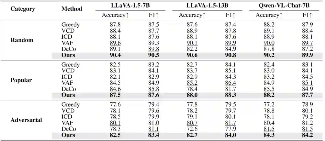 实验结果 为了验证 HulluEdit 的有效性,研究团队在 LLaVA-1.5、MiniGPT-4、mPLUG-Owl2 以及 Qwen-VL 等多种代表性多模态大模型上进行了全面评估 。实验结果显示,在 POPE 和 CHAIR 等核心幻觉评测基准中,HulluEdit 在所有评估设置下均取得了最优的准确率与 F1 分数,特别是在语言先验干扰最严重的对抗性(Adversarial)测试中表现出极强的稳健性,证明了其在复杂冲突场景下对视觉证据的强大保护能力 。此外,在 MME 综合能力评估中,该方法在显著增强物体存在性、位置及颜色感知能力的同时,有效维持了模型的通用视觉理解水平 。值得注意的是,得益于高效的单次前向传播设计,在解码吞吐量(TPS)上大幅超越了 OPERA 和 HALC 等近期先进方法,在兼顾效率的同时显著提升了幻觉抑制。