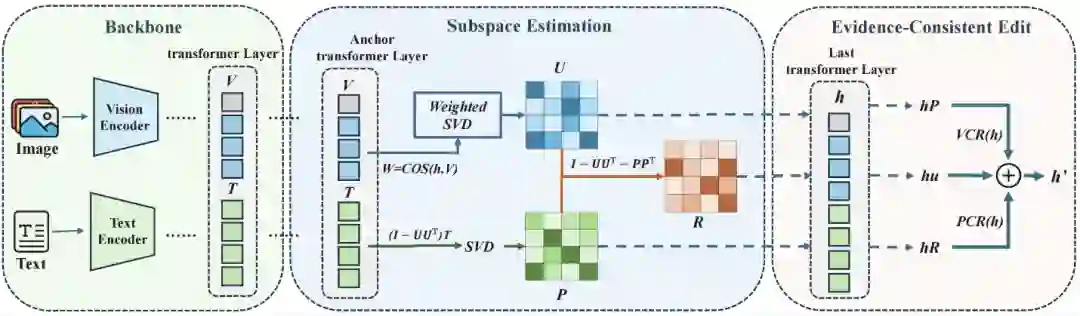 如图2所示,HulluEdit 框架通过三阶段实现高效且证据一致的幻觉抑制:首先选取模型中间层作为锚点层提取稳定的视觉特征,并同步维护动态文本缓存以捕获潜在的偏见模式;随后通过加权奇异值分解(Weighted SVD)在线估计视觉证据子空间U,并在其正交补空间内构建抗先验子空间 P,从数学上强制正交性约束以确保对先验的抑制完全不会干扰真实的视觉接地信息 ;最后,在模型输出层将隐藏状态 h正交分解为视觉证据、冲突先验与残差不确定性三个分量,并根据视觉确定性(VCR)与先验冲突(PCR)比率动态校准编辑强度,通过最小范数闭式解对冲突信号进行强度自适应的收缩,从而在维持生成流利度的同时,实现精准且稳健的去幻觉干预 。