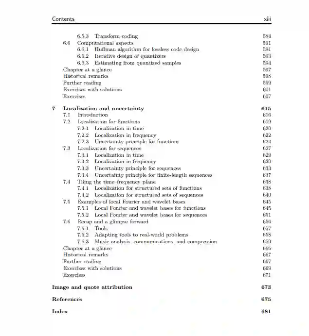 第7章,局部化和不确定性,介绍了单个向量的时间、频率、尺度和分辨率特性;这些属性建立了我们的直觉,让我们知道单个表示系数可能捕捉到什么,也可能捕捉不到什么。然后,我们研究用于表示信号的向量集的这些性质。具体地说,时间和频率本地化导致了时频平面的概念,傅里叶技术和小波技术之间的本质区别变得明显:傅里叶技术使用频率上的等间距向量,而小波技术使用频率上的幂律间距向量;此外,傅里叶技术使用等尺度的向量,而小波技术使用几何间距的尺度。我们以真实信号的例子结束,以发展对各种信号表示的直觉。