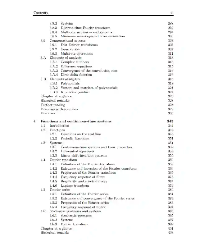 第四章,函数与连续时间系统,平行于第三章;向量现在是一个依赖于连续时间的函数,关于这些向量的一个重要的线性算子是那些对时移不变的;这些是卷积算子。这些运算符自然地导致使用傅里叶变换的信号表示,对于循环扩展的有限长度函数,或周期函数,傅里叶级数。这两章中的四种傅里叶表示在不同的领域中例证了线性、移位不变算子或卷积的对角化。