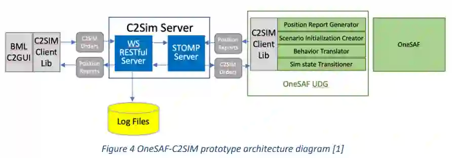 为支持 2019 年 CWIX 演习,雷斯顿测试中心(RTC)开发了 OneSAF 的原型扩展,以便与实施 C2SIM 标准草案的系统对接。该原型设计有三个主要目标:(1) 通过 C2Sim 服务器集中控制模拟;(2) 向 C2Sim 客户端提供实体位置报告;(3) 根据 C2Sim 命令启动模拟行为。开发过程包括用一个新组件增强现有的 OneSAF 用户数据网关(UDG),以便与 C2Sim 服务器进行有效通信。该接口采用了简单文本定向消息协议(STOMP)用户,并将 C2Sim 订单翻译成 JavaScript Object Notation (JSON),以便与 UDG 进行无缝交互。该原型扩展的架构如图 4 所示。尽管 C2Sim 标准的草案性质和有限的开发资源带来了挑战,导致 OneSAF 中的保真度有限且需要硬编码行为输入,但原型成功地展示了基础级别的互操作性[1]。
