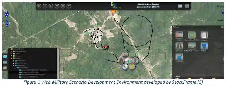 任务规划工具是一种专门用于生成作战方案的应用程序。这些工具可能类似于计算机生成的部队应用程序或 C2 系统(或两者的某种组合),但不具备执行模拟的能力。相反,它们为模拟系统输出必要的信息,以初始化其实体。直到最近,这都是通过军事场景定义语言(MSDL)完成的,但 C2SIM 最近取代了这一标准。Forcebuilder 和 StackFrame 的 Web 军事场景开发环境 (WebMSDE) 是任务规划工具的两个实例。Forcebuilder 是一个可生成 MSDL 文件的增强型 Microsoft Access 数据库,在战斗实验室协同仿真环境(BLCSE)上执行的 "统一挑战 LVC "演习(2017-2019 年)期间被广泛使用。WebMSDE(如图 1 所示)是一款功能强大的场景生成工具,作为 "一支半自动化部队"(OneSAF)[5]的一部分而开发。