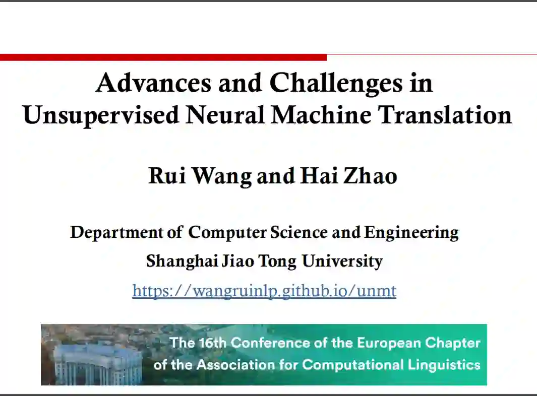 无监督跨语言表示初始化方法与去噪、反翻译等机制一起,发展了无监督神经机器翻译(UNMT),取得了令人印象深刻的效果。与此同时,UNMT仍面临若干挑战。本教程首先介绍UNMT的背景和最新进展。然后,我们审查了UNMT面临的一些挑战,并就该技术目前的表现给出了实证结果。