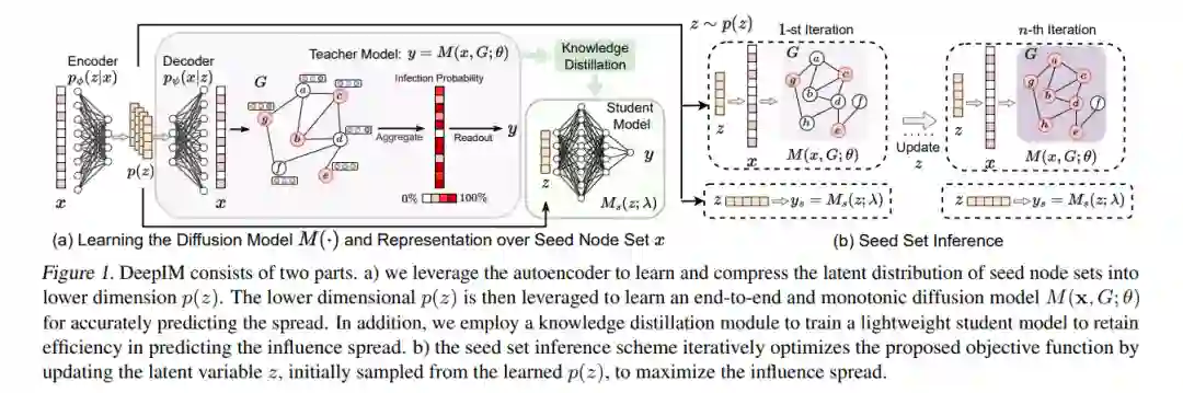 影响力最大化(IM)被定义为从社交网络中选择一组初始用户,以最大化受影响用户的预期数量。研究人员在设计各种传统方法方面取得了很大进展,它们的理论设计和性能提升接近极限。在过去的几年里,基于学习的IM方法应运而生,比传统方法在未知图上具有更强的泛化能力。然而,基于学习的IM方法的发展仍受到一些基本障碍的限制,包括:1)有效解决目标函数的难题;2)表征多样化潜在扩散模式的难题;以及3)在各种以节点中心性为约束的IM变体下调整解决方案的难题。为应对上述挑战,我们设计了一个名为DeepIM的新颖框架,以生成性地表征种子集的潜在表示,并提议以数据驱动和端到端的方式学习多样化的信息扩散模式。最后,我们设计了一个新颖的目标函数,以推断在灵活的基于节点中心性的预算约束下的最优种子集。在合成和真实世界数据集上进行了大量分析,以展示DeepIM的整体性能。代码和数据可在以下地址获取:https://github.com/triplej0079/DeepIM。