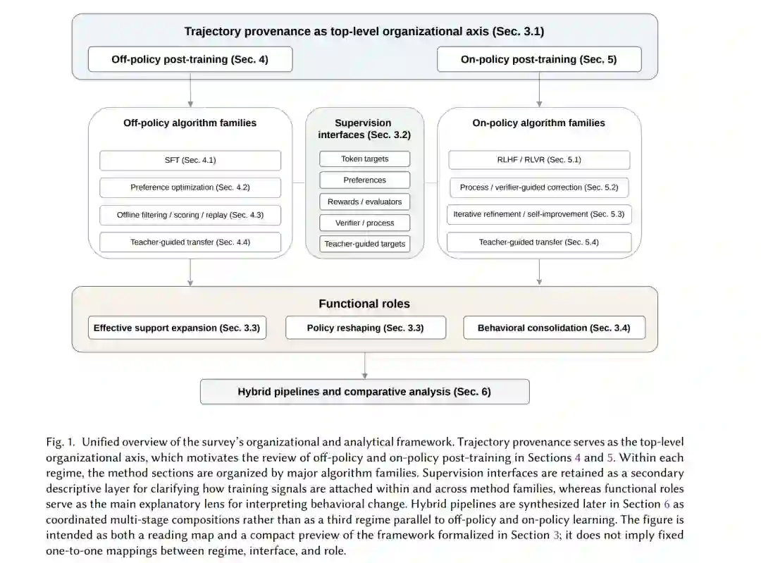 提出了轨迹来源作为 LLM 后训练的统一顶层组织轴,利用离策学习与在策学习的区别,根据优化实际发生的地点来构建领域版图。 1. 保留了监督接口作为次要描述层,使标记目标(token targets)、偏好、奖励衍生信号、基于验证器或过程的反馈以及教师引导目标,能在跨后训练范式的共享词汇表中进行比较。 1. 引入了以有效支撑集扩张、策略重塑和行为巩固为核心的功能角色分析,从而为刻画后训练阶段的主导行为效应或系统角色提供了共同的解释性词汇。 1. 利用这一分层框架在单一分析语言下比较主要范式,解释了为何混合流水线会自然地作为协同的多阶段系统出现,并揭示了关于学习器状态纠正、支撑集损耗、巩固及阶段组合的开放问题。