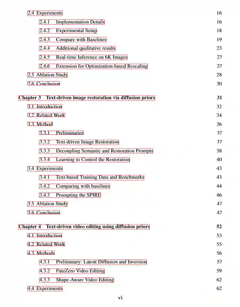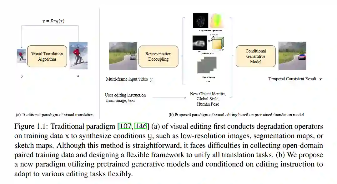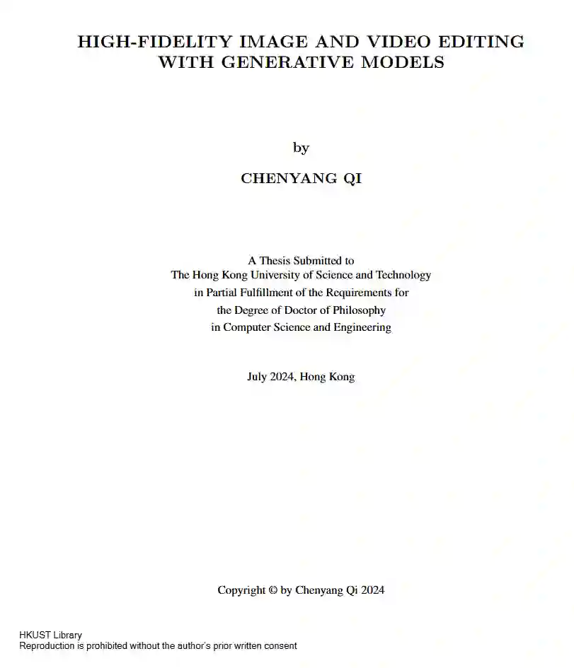 近年来,在计算摄影、虚拟现实、游戏和电影产业等领域,对视觉内容(如2D图像和多帧视频)的需求不断增长。为了满足这些需求,研究者们提出了多种生成模型,包括VQVAE、GAN和扩散模型(Diffusion Models),以促进从噪声或文本生成视觉内容。然而,如何将这些模型应用于更实际的图像到图像生成任务(也称为图像处理与编辑)仍然是一个开放的挑战。本论文探讨了基于生成模型的图像编辑范式,重点关注来自大规模预训练的基础模型。 我们首先探索了实时图像缩放技术。现代相机拍摄的图像可以达到6K分辨率,但这些图像占用的存储空间过大。为此,我们提出了一种量化自编码器,通过优化熵损失将大型6K图像压缩为JPEG缩略图,从而减小文件大小。随后,一个高效的解码器可以实时将低分辨率缩略图还原为高分辨率图像。 接着,我们转向文本驱动的图像修复技术。相机运动、数字电路噪声以及恶劣天气(如雨和雾)可能会降低摄影师拍摄的图像质量。我们提出了一种基于扩散模型的图像修复方法,该方法通过语义和修复指令进行引导。为了以较低的训练成本实现这种多模态应用,我们使用合成退化图像对预训练的潜在扩散模型进行适配器微调。 最后,我们讨论了文本驱动的视频编辑方法。除了图像层面的计算摄影外,创意特效也广泛应用于游戏、电影和短视频应用中。这些特效通常需要时间运动一致性和语义层面的编辑,例如身份和风格。由于目前没有鲁棒且开源的视频生成模型可用,我们专注于以零样本方式利用文本到图像的潜在扩散模型。具体来说,我们将图像生成模型转换为视频模型,并在DDIM反演过程中提取扩散Unet中的时空注意力图,作为运动和几何表示。然后,在DDIM去噪过程中,根据目标提示重新使用这些注意力图。我们简洁的框架能够在保持显著时间一致性的同时,实现形状、属性和全局风格的编辑。