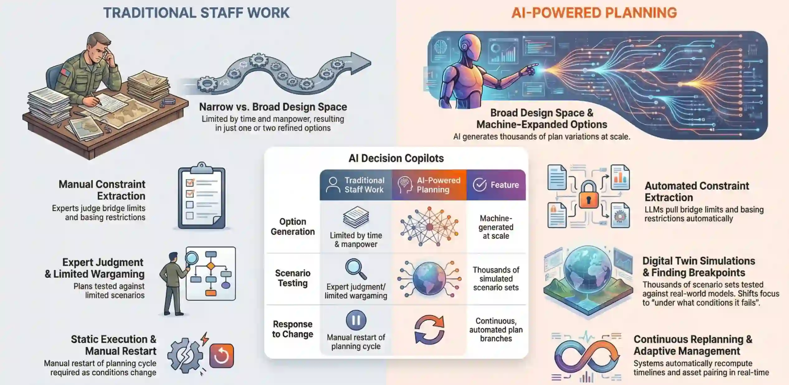 人工智能驱动的规划将这一过程从一个狭窄的选项制定过程转变为一个广泛的选项生成和测试过程。人工智能系统可以在指挥官决策之前,生成、比较和压力测试成千上万种变体,而不是只制定一两个精炼的计划。