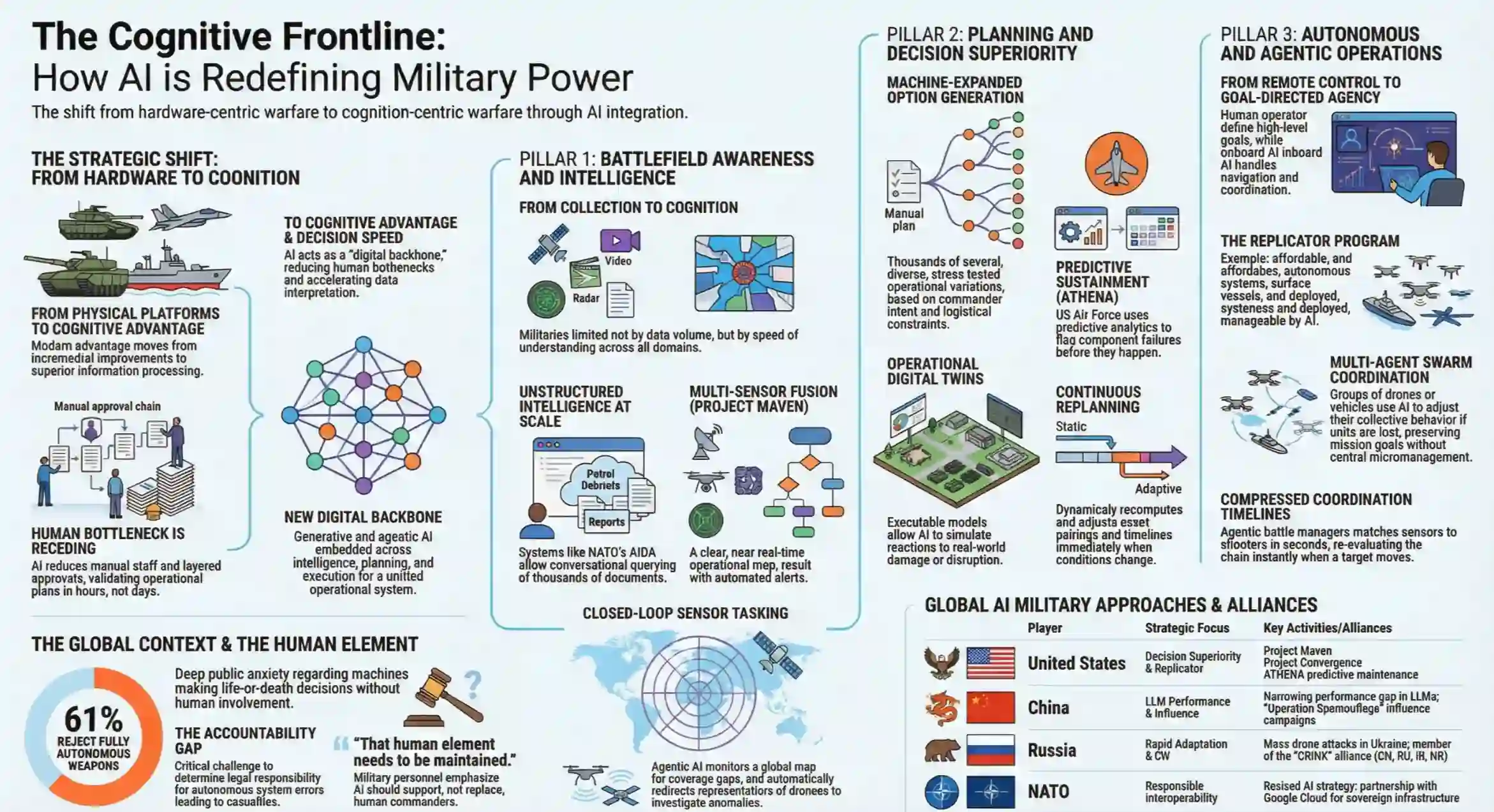 这一基础正在从平台优势转向认知优势。在信息处理、规划速度和协同执行的驱动下,战争正变得不那么以硬件为中心,而更以认知为中心。分析和参谋工作中的人力瓶颈正在被削减。现代军队越来越多地依赖人工智能来加速其解读数据、生成选项和协调行动的方式。