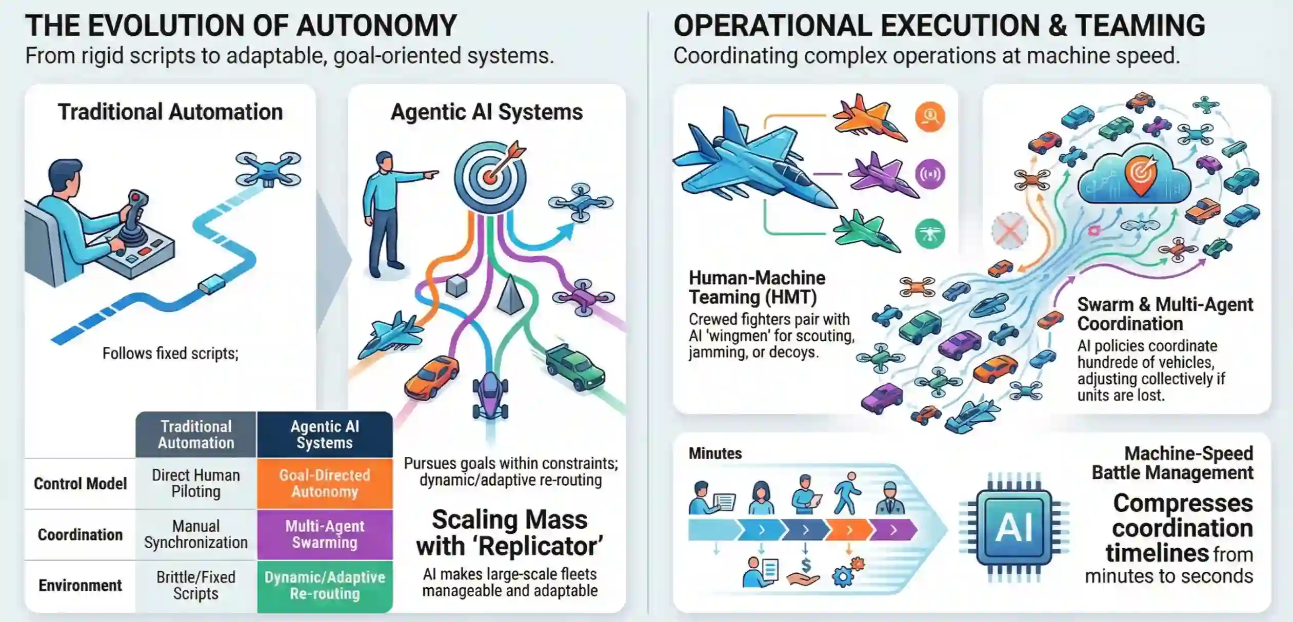 关键的转变是从自动化到自主智能。早期的军事自动化遵循固定的规则和脚本。代理式人工智能系统朝着目标运行。它们监控条件、评估选项,并在指挥官定义的约束范围内调整行为。这改变了部队如何在对抗性环境中生成力量、管理风险和维持作战节奏。