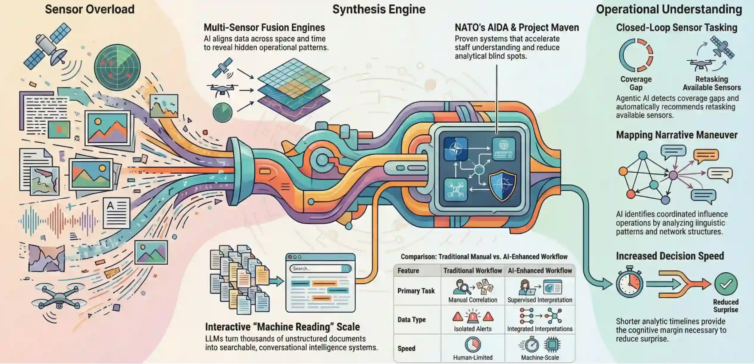 人工智能驱动的战场感知不仅仅是更快的探测。它是将零散的、多格式的、时常矛盾的输入转化为连贯的、可用于决策的情报。生成式与代理式人工智能系统现在充当情报团队的认知放大器,变革着原始输入如何转化为态势理解的过程。